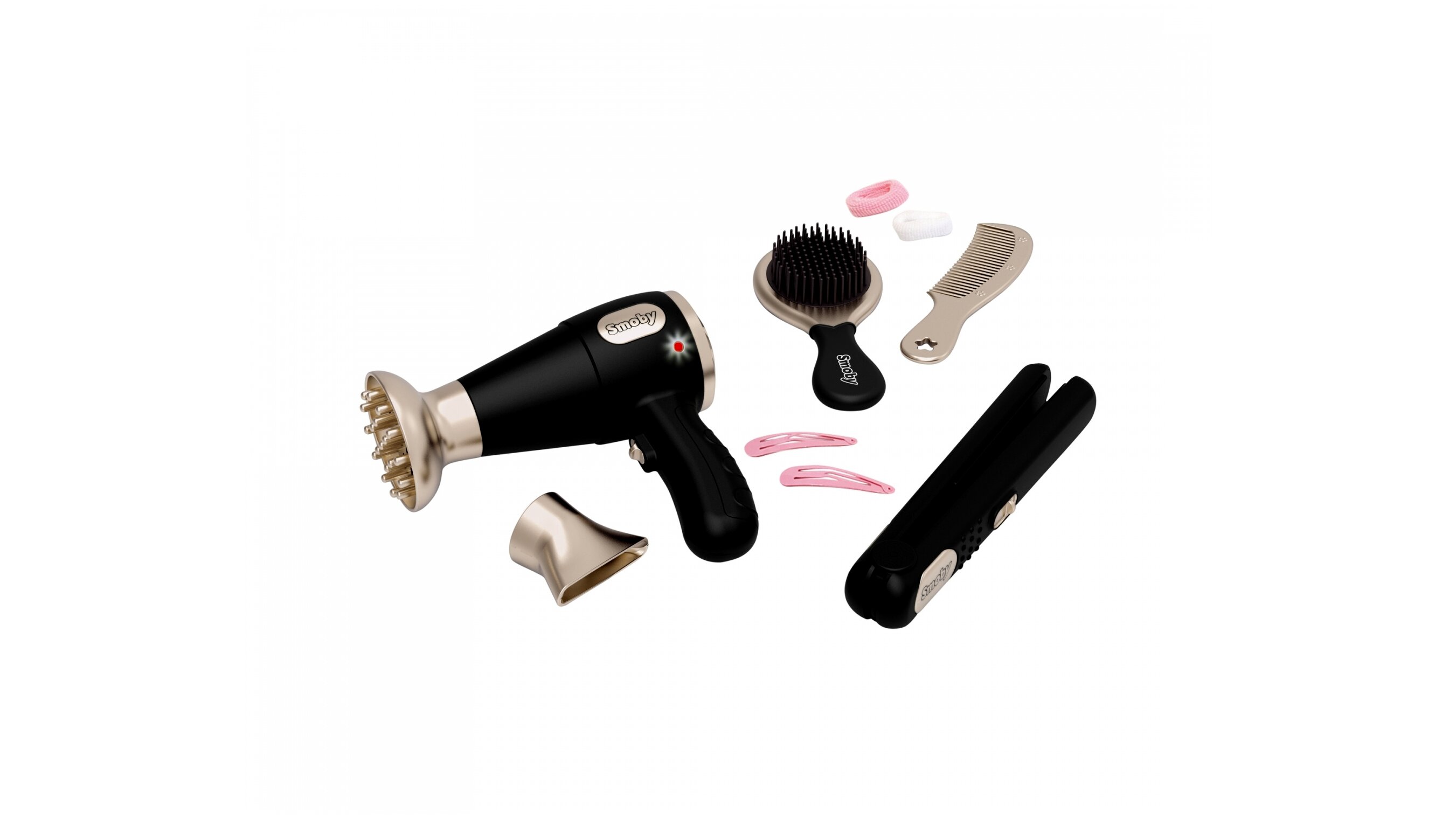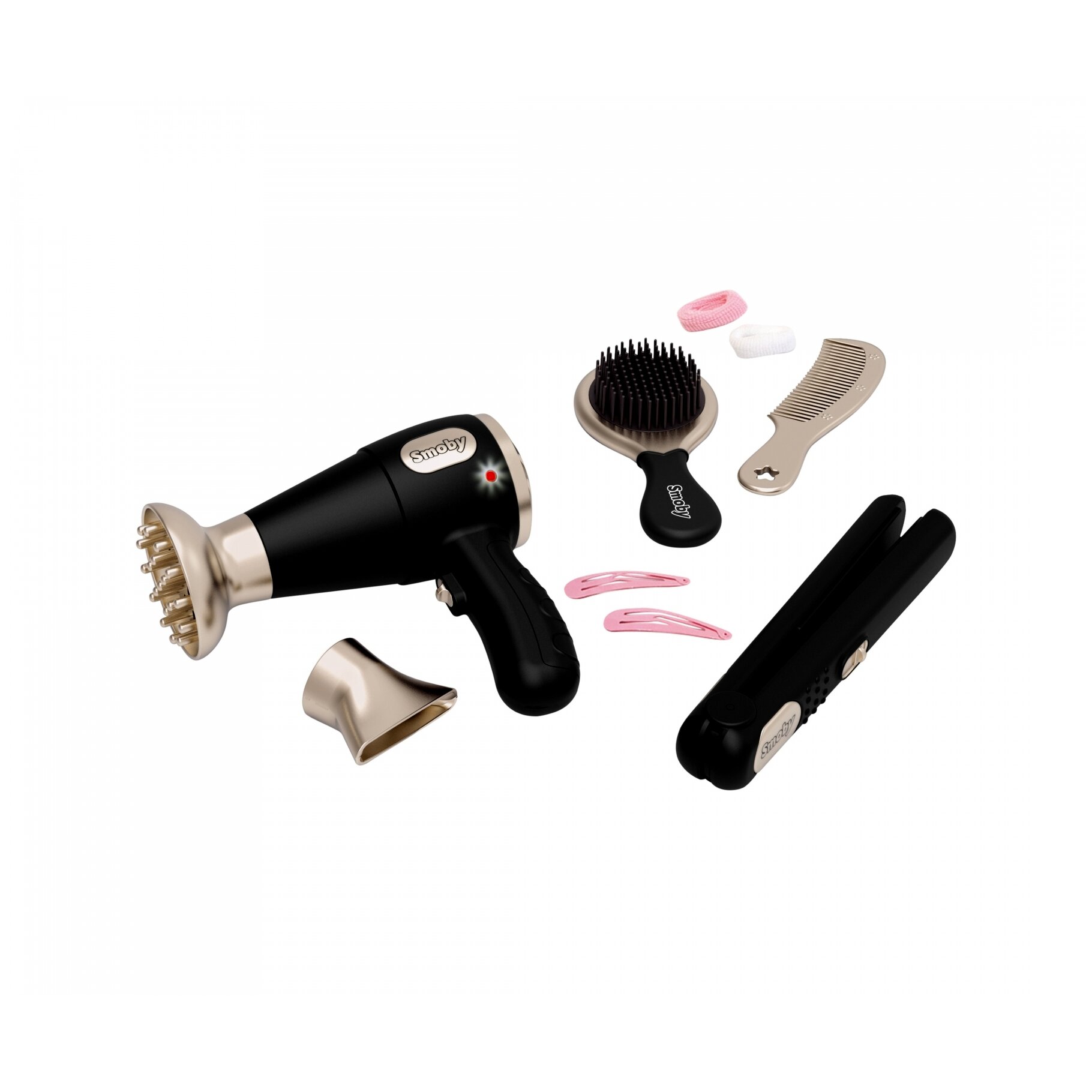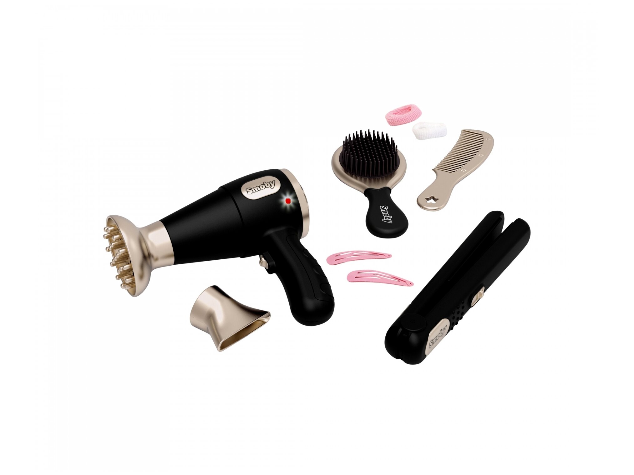 A fodrászat játékszettel a kislányok szebbnél szebb frizurákat készíthetnek el maguknak, a barátaiknak vagy az egész családnak. A 10 részes csomag modern és stílusos kelléket tartalmaz: hangot adó, világító hajszárítót 2-féle cserélhető véggel, hajkiegyenesítőt, hajkefét, fésűt, valamint csatokat és hajgumikat.