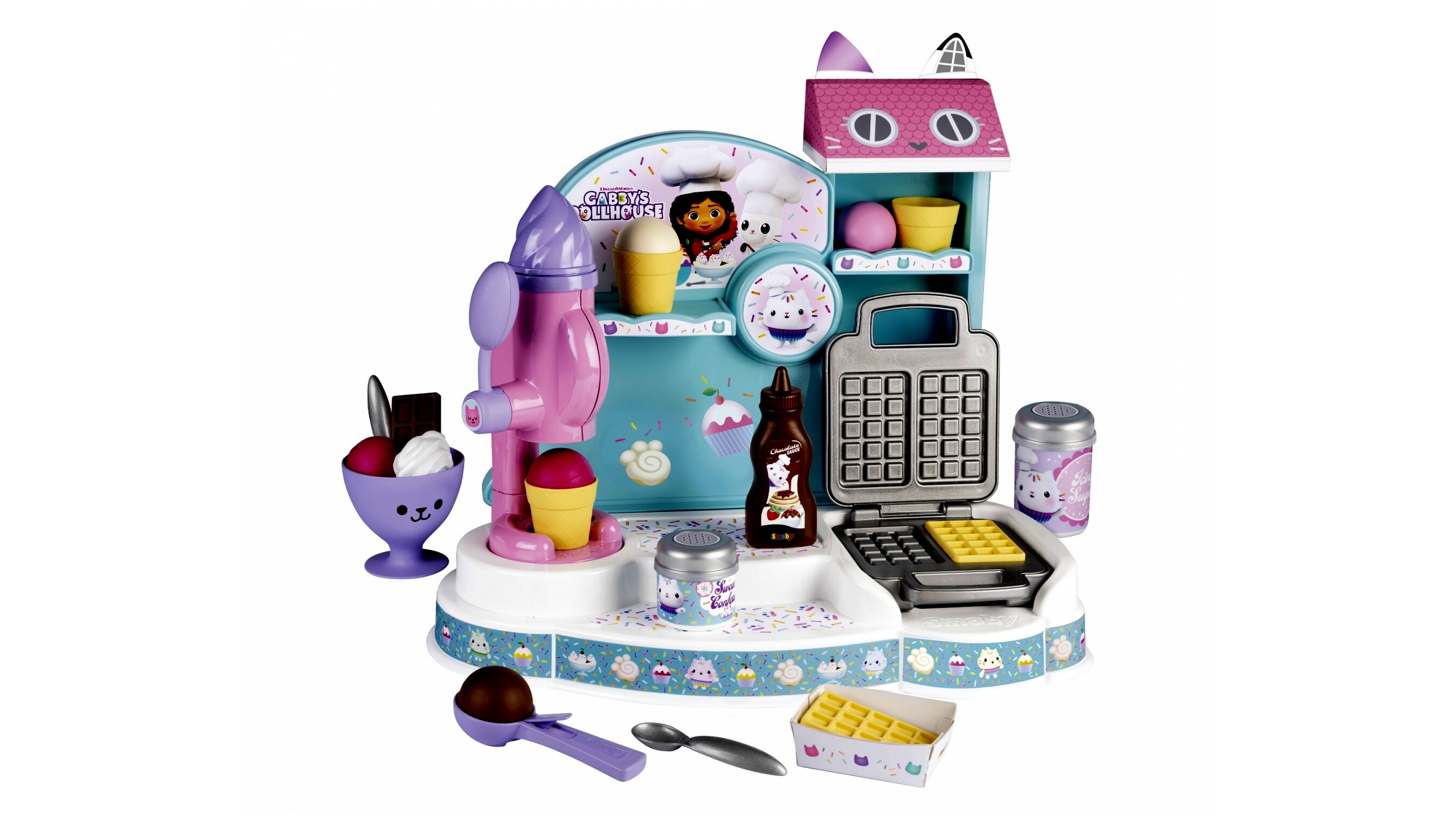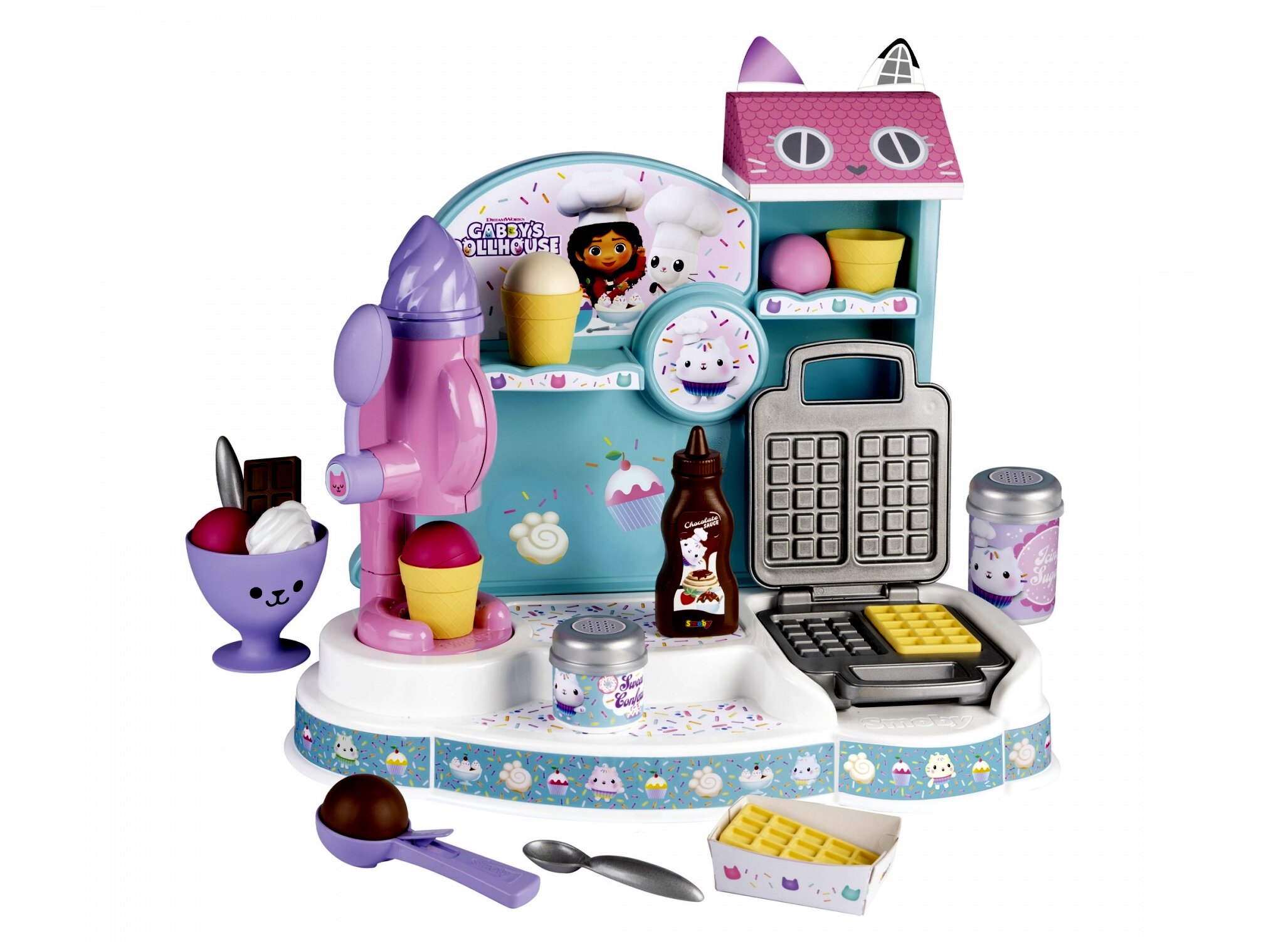 A gyerekek Gabi babaháza édes világába kóstolhatnak bele ezzel a játékszettel. Az interaktív játékszett 20 darab kiegészítővel rendelkezik, amelyekkel fagylaltokat és gofrit készíthetnek a fagyigyáros gyerkőcök. Lekváros gofri tejszínhabbal? Vagy inkább egy csokis-vaníliás fagyi? Az édességeknek csak a képzelet szab határt... hiszen mindenki tudja, hogy egy kis desszertnek mindig van hely.A játék lehetőséget teremt a szerepjátékra, amely során fejlődik a gyerekek képzelete, fantáziája, kreativitása és kommunikációja.