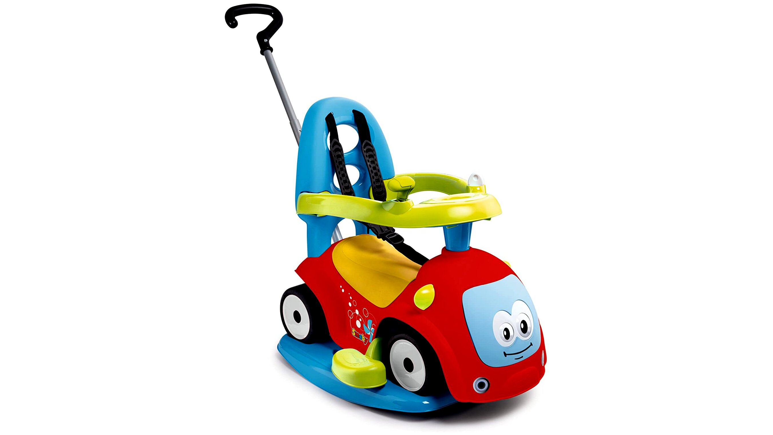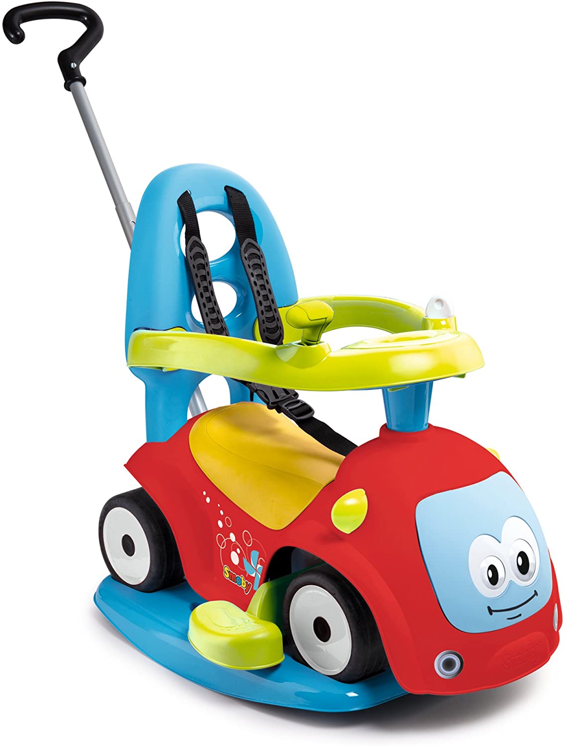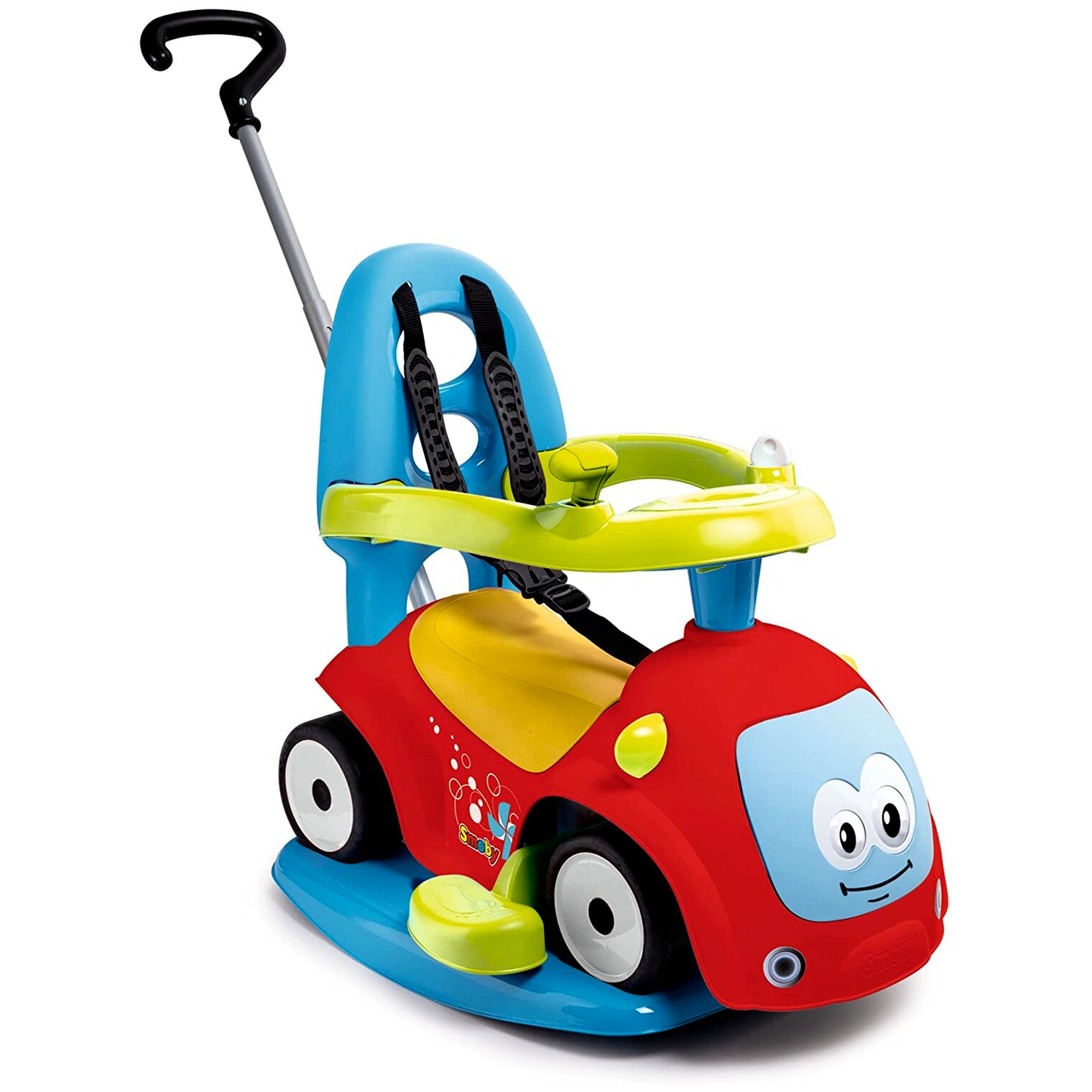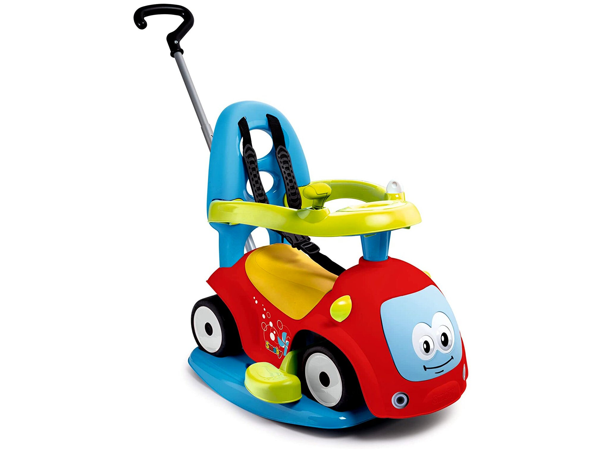 - Smoby Maestro Balade bébitaxi elektronikus dudával, piros-kék színben a korai időszakban az aljára rögzíthető íves talp hintaszékként funkcionál