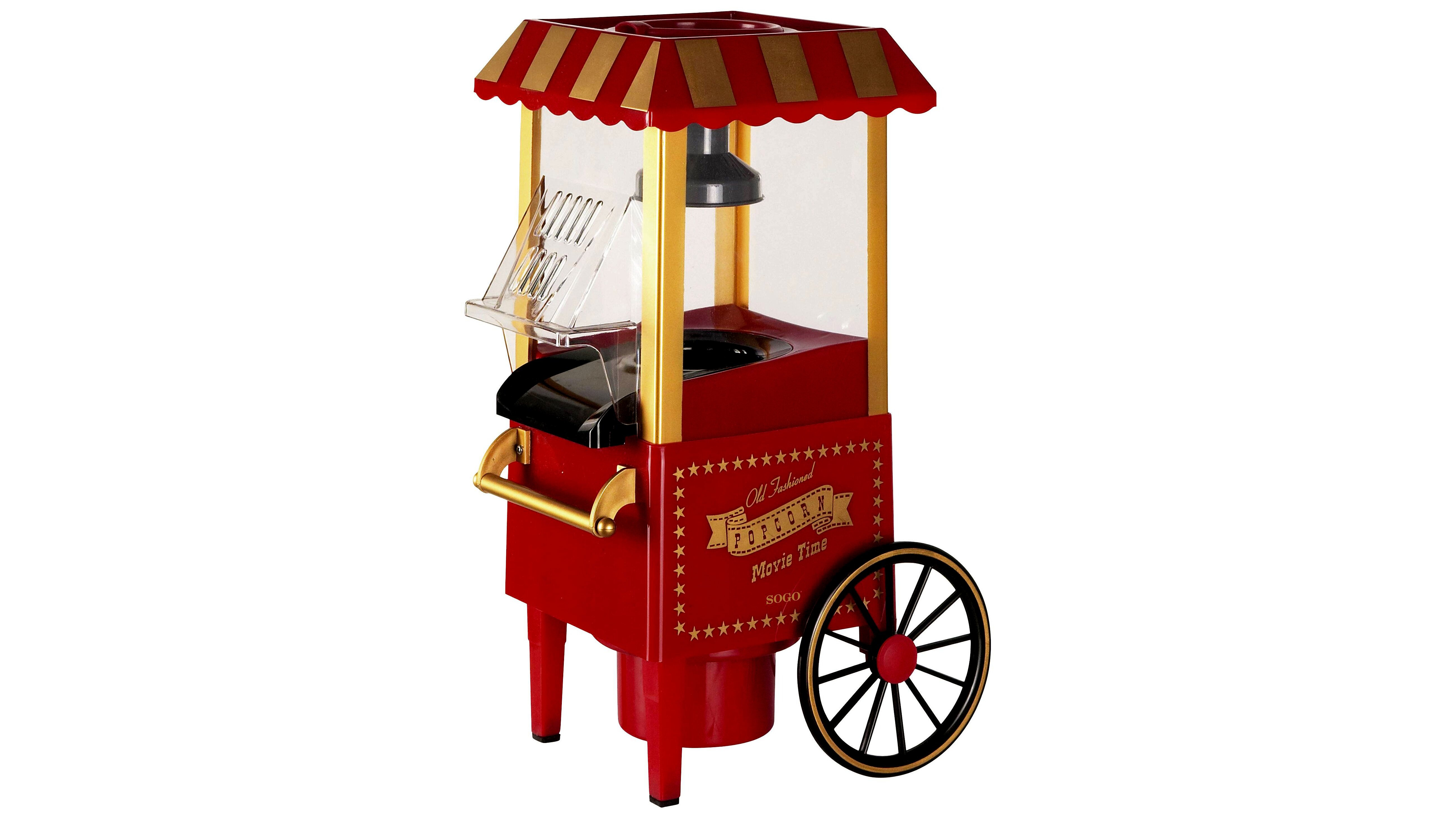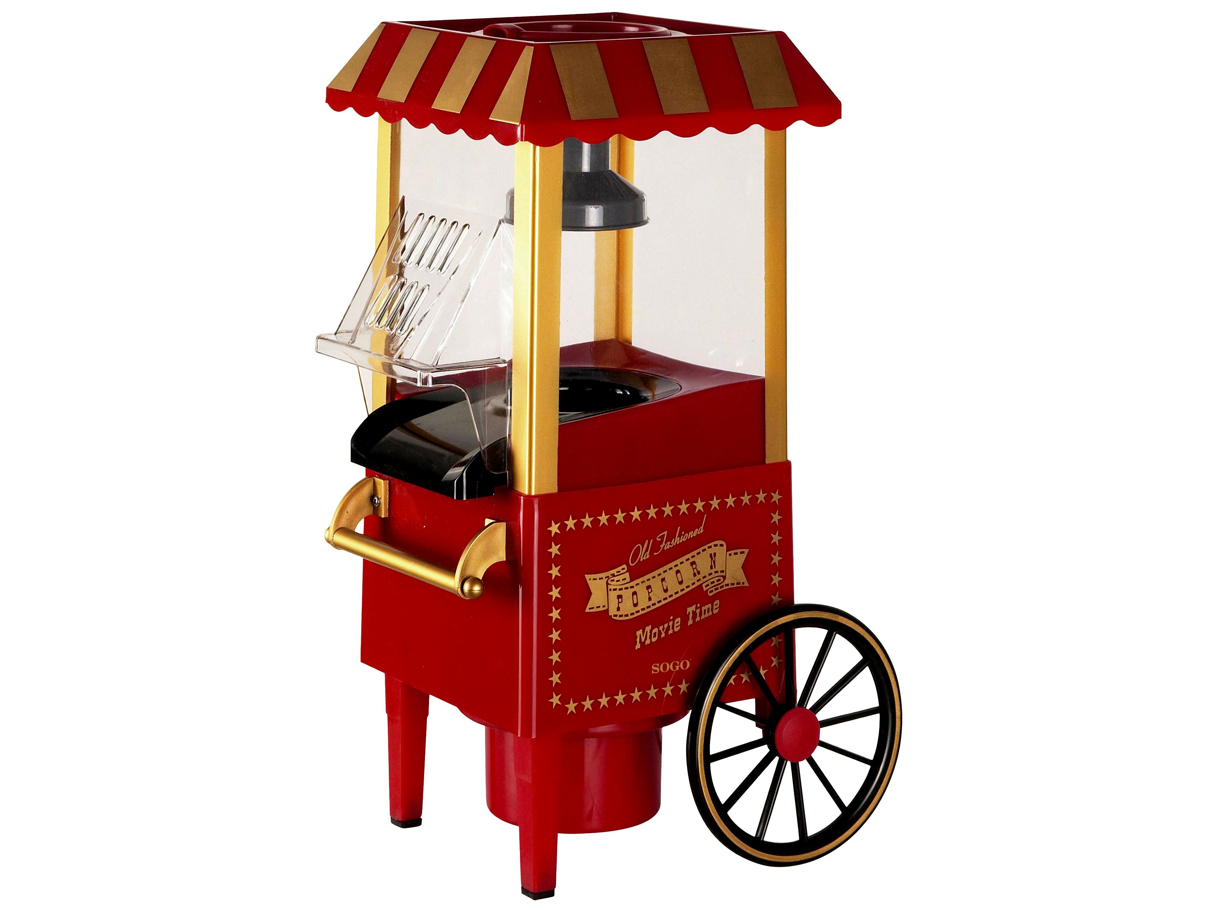 A készülék a klasszikus mozis popcornkocsik hangulatát idézi, látványos piros-arany megjelenéssel és átlátszó kabinnal, így jól mutat játék-/szórakozószobában vagy családi programoknál. A csúszásgátló lábak és a stabilabb kialakítás a biztonságosabb használatot segítik.