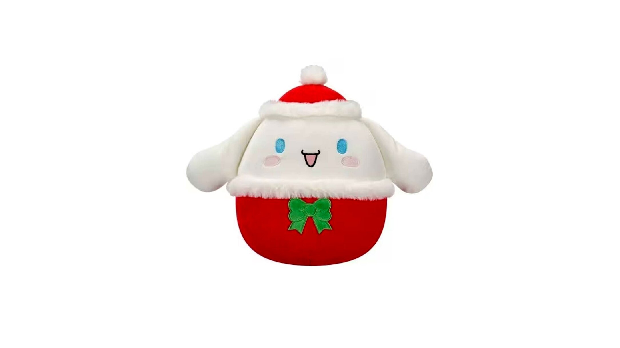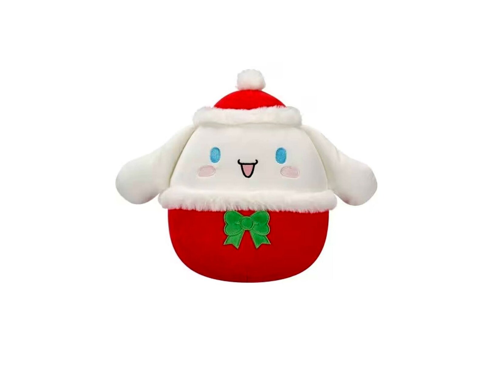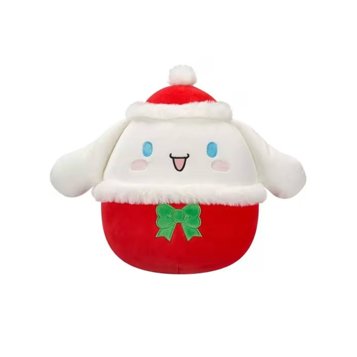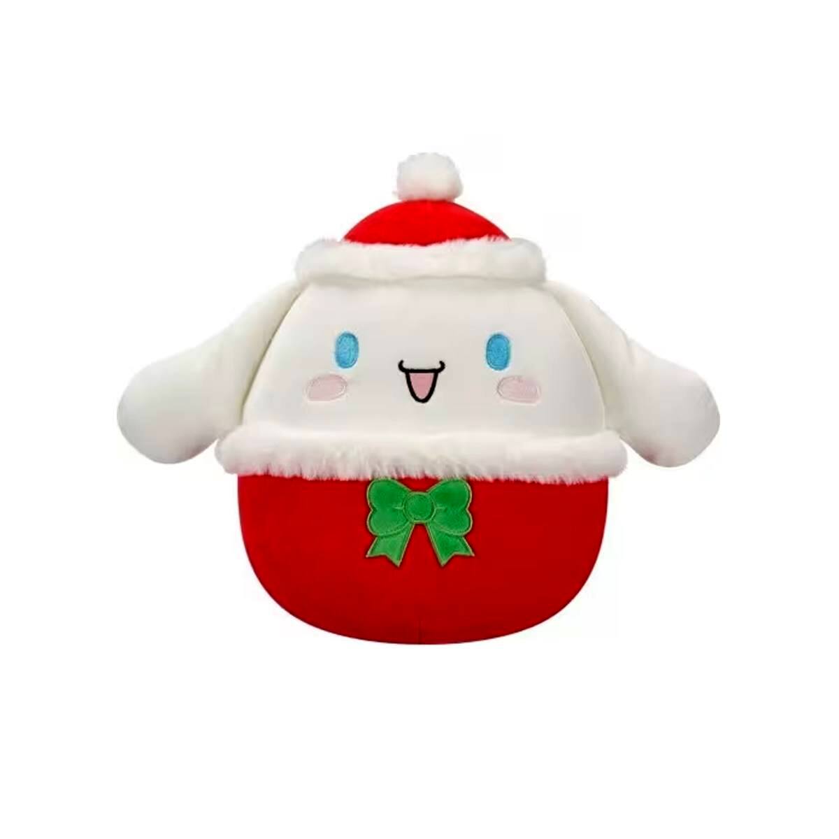 A Cinnamoroll karakter egy piros ünnepi sapkát visel, zöld masnival díszítve, ami azonnal ünnepi hangulatot teremt. A finom részletek, az aranyos arckifejezés és a gondosan kidolgozott színek igazán különlegessé teszik a plüssfigurát, így nemcsak játéknak, hanem dekorációnak is kiváló.