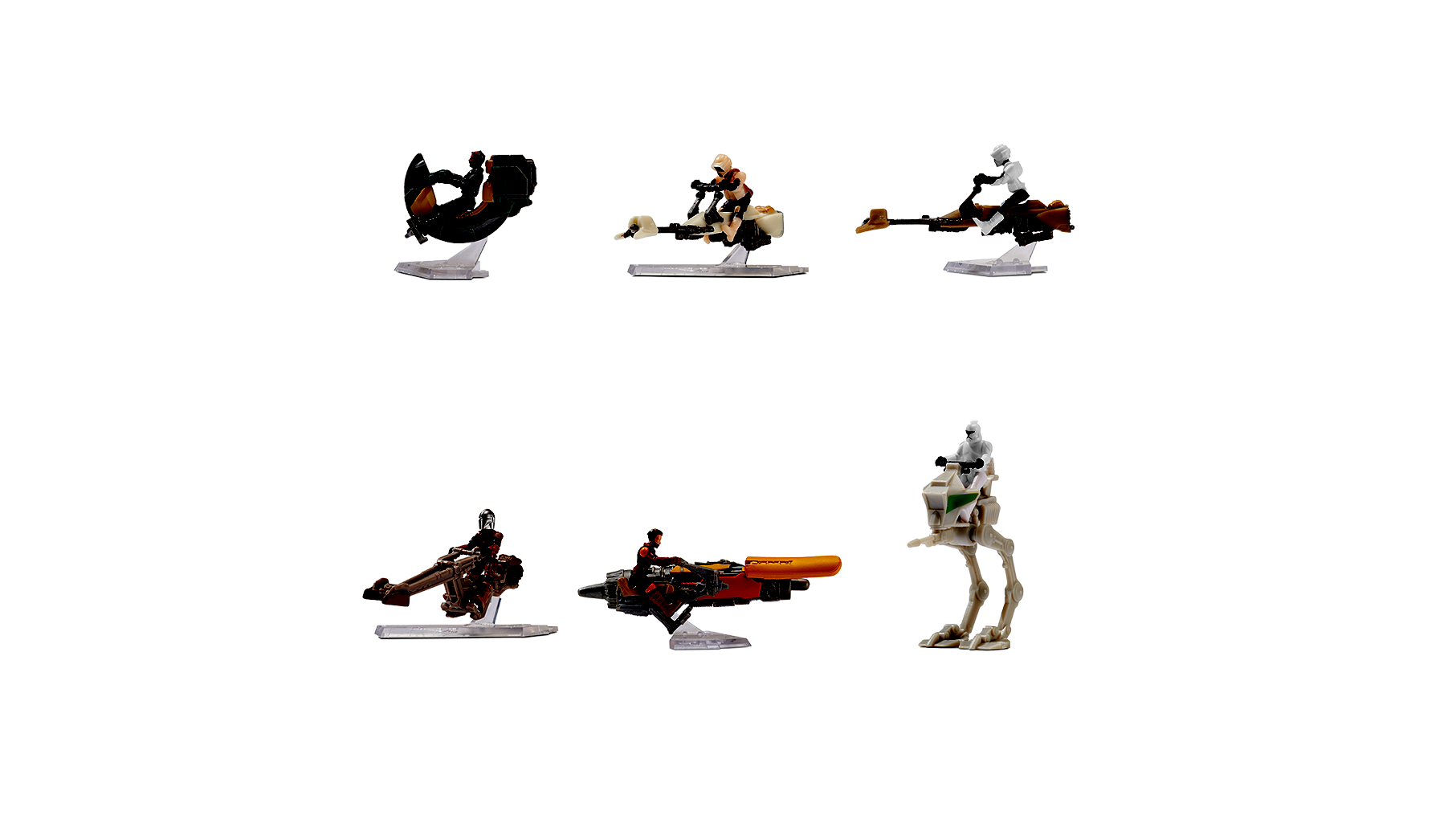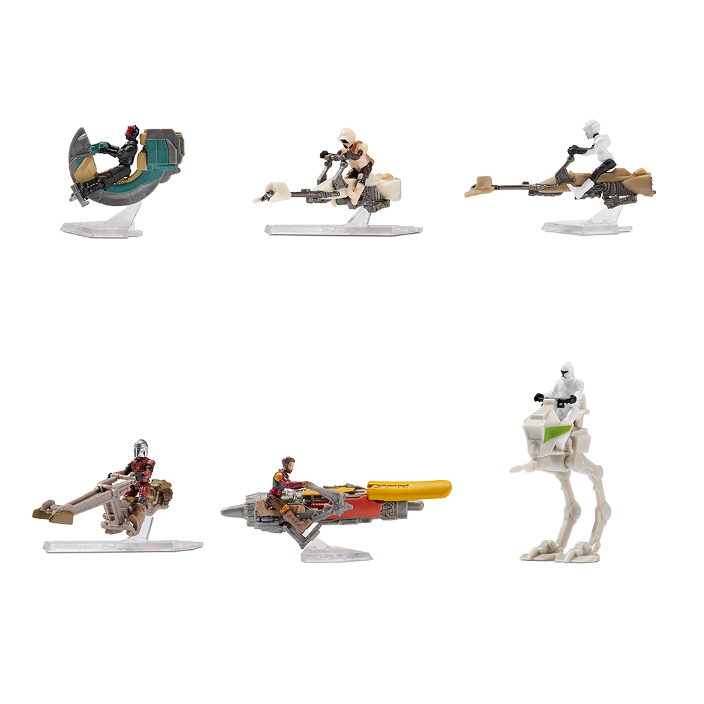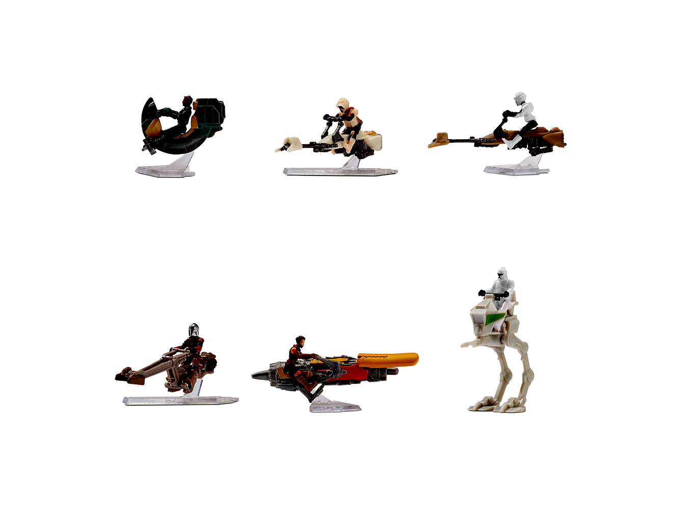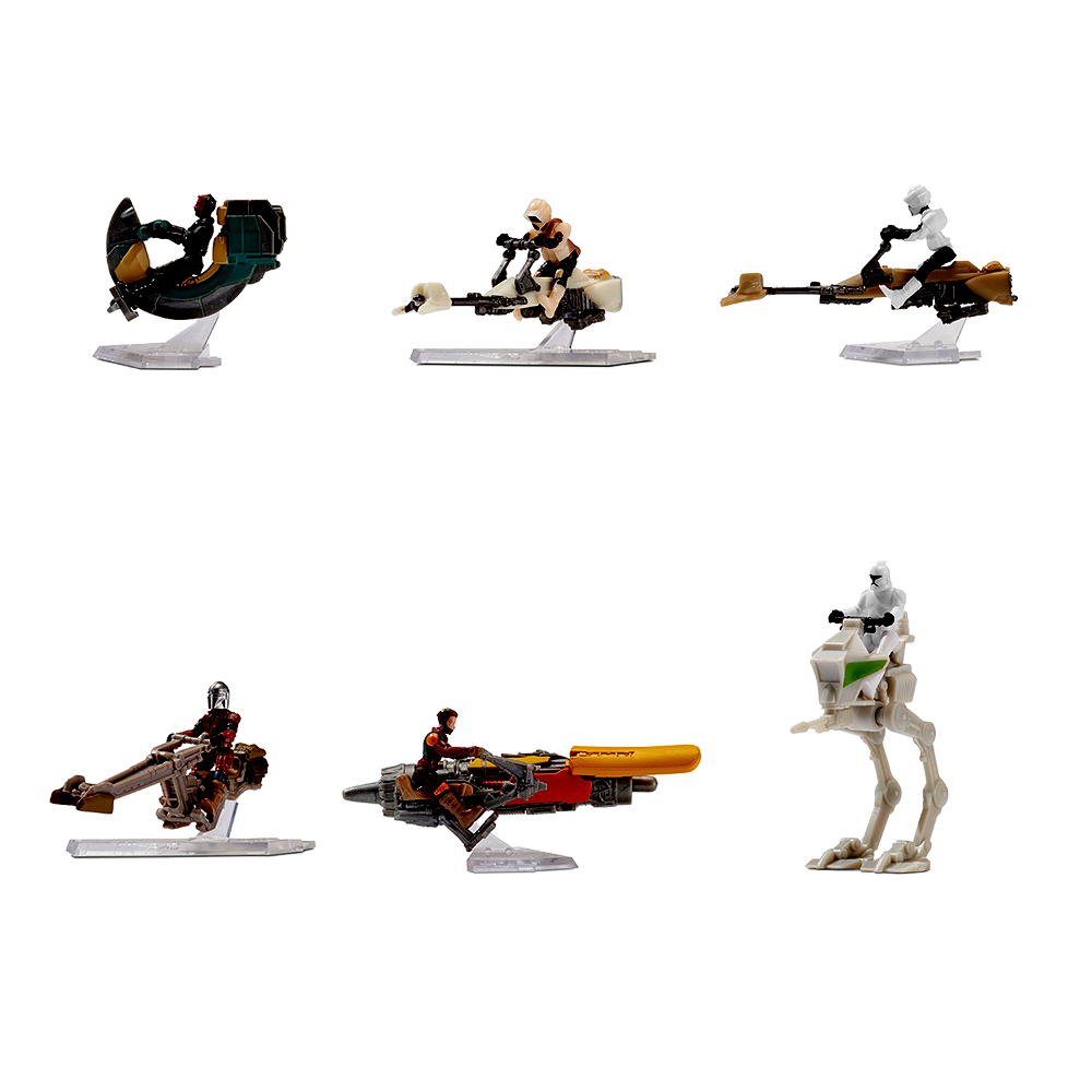 Minden csomag tartalmaz egy ikonikus Csillagok háborúja filmből származó járművet figurával.
