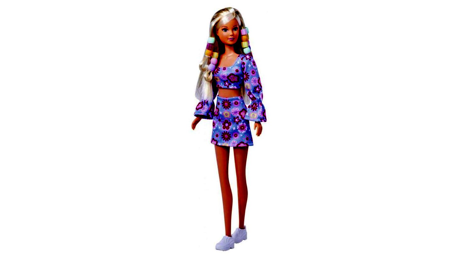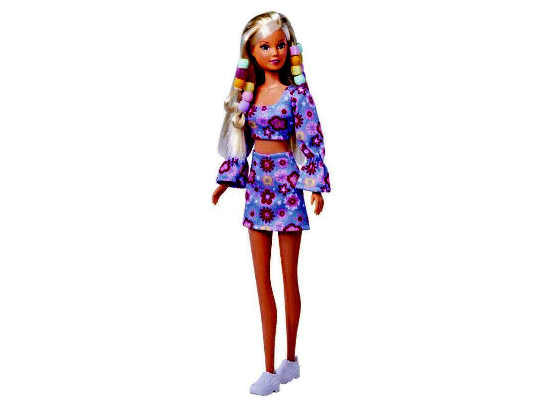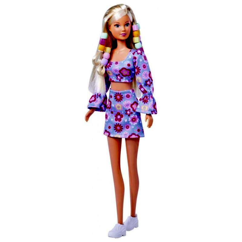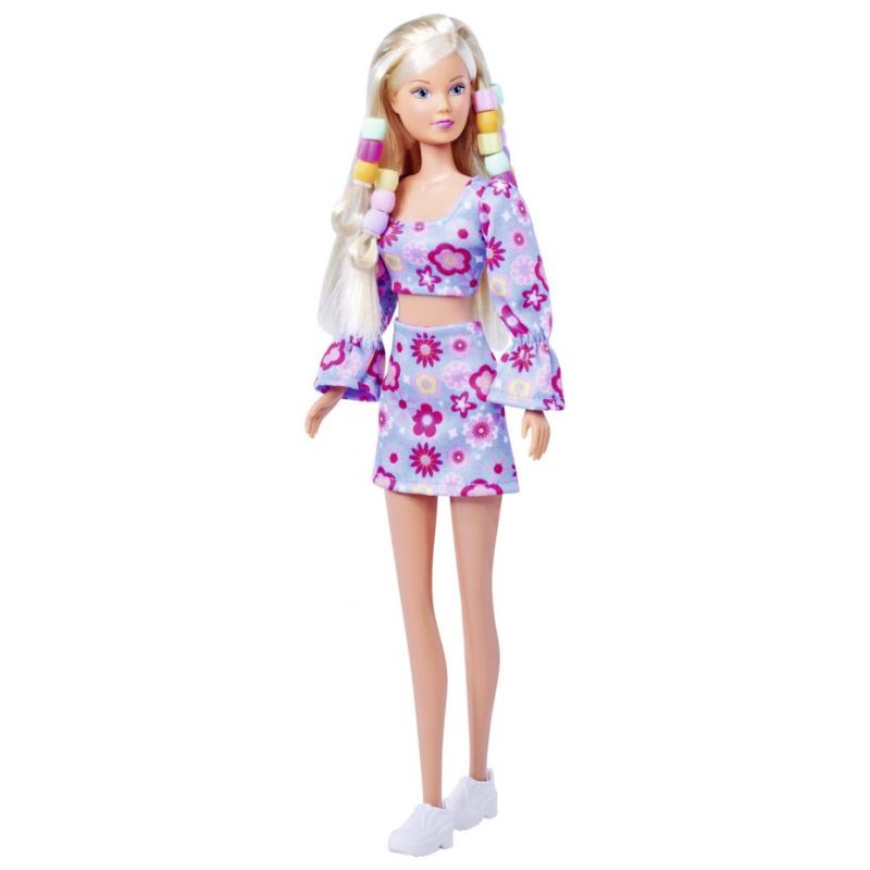 Steffi Love kétrészes, virágmintával díszített ruhát visel, amit remekül kiegészítenek majd a hajba valók. A baba nem áll meg magától, azonban végtagjai mozgathatók, így a gyerekek különböző pozíciókba állíthatják be.