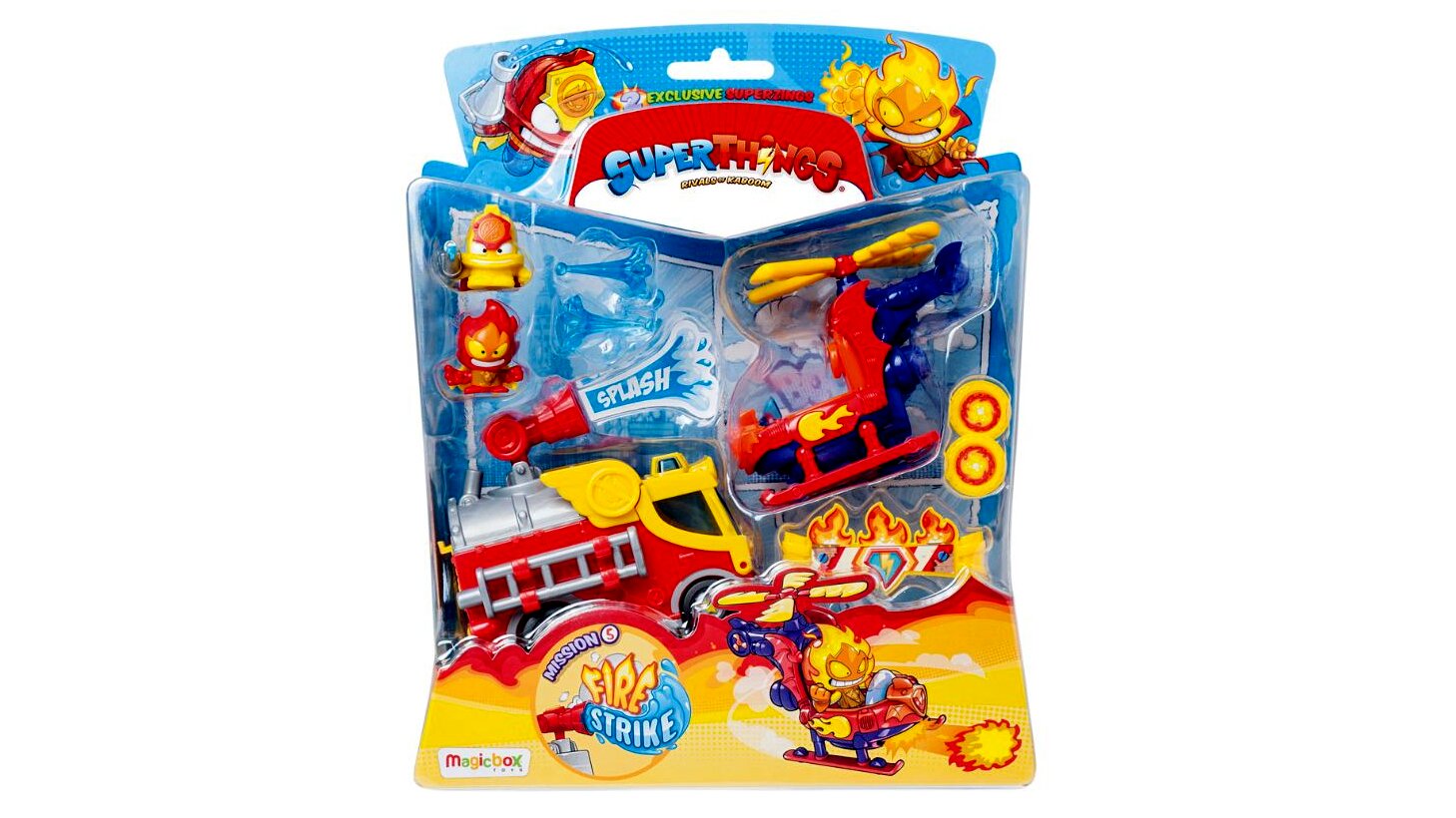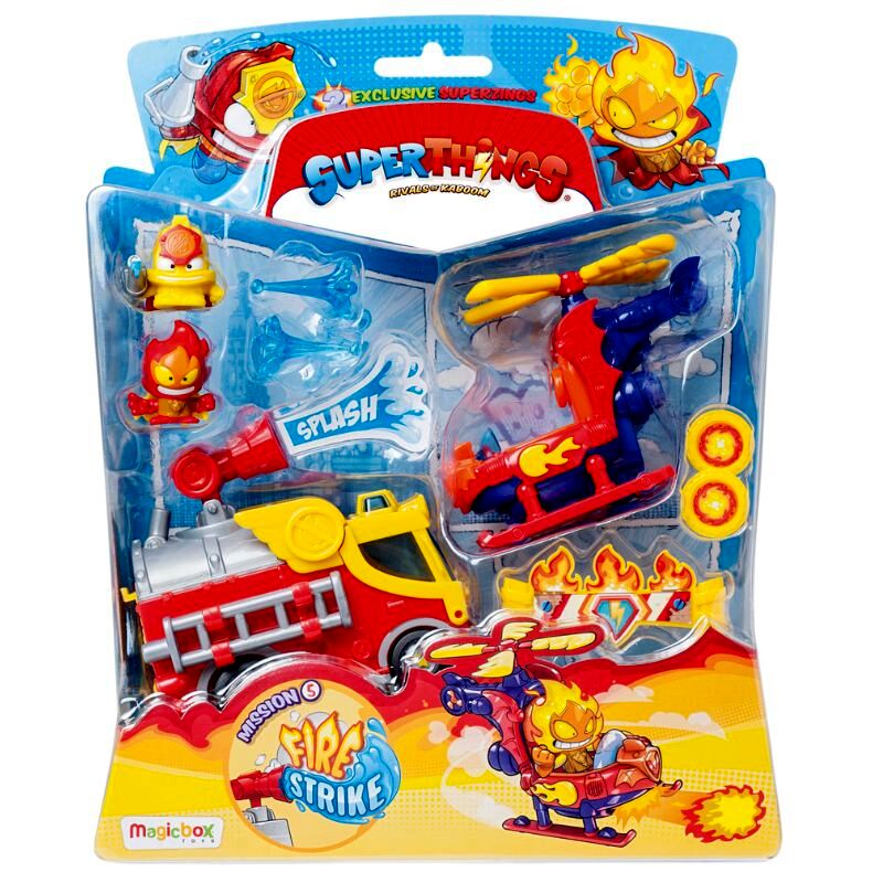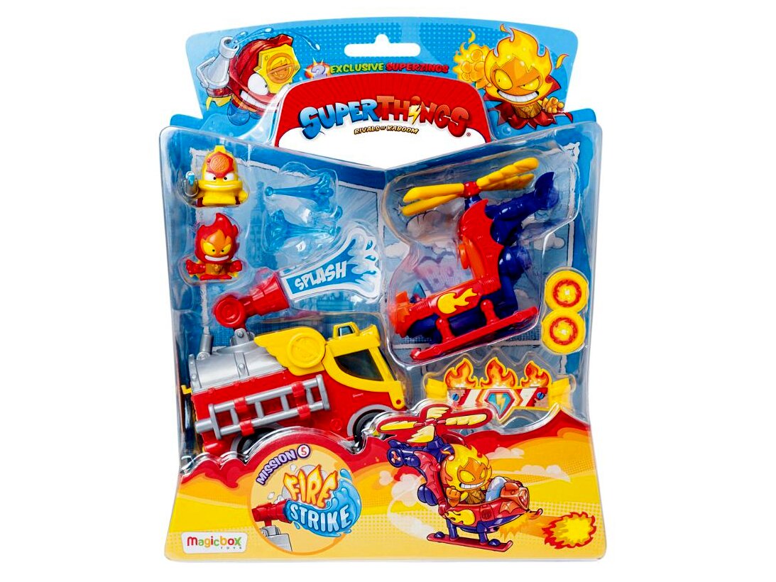 Tartalom: 1 db tűzoltóautó, 1 db helikopter, 2 db SuperThing figura, vízsugarak, tűzkorongok és más kiegészítők.