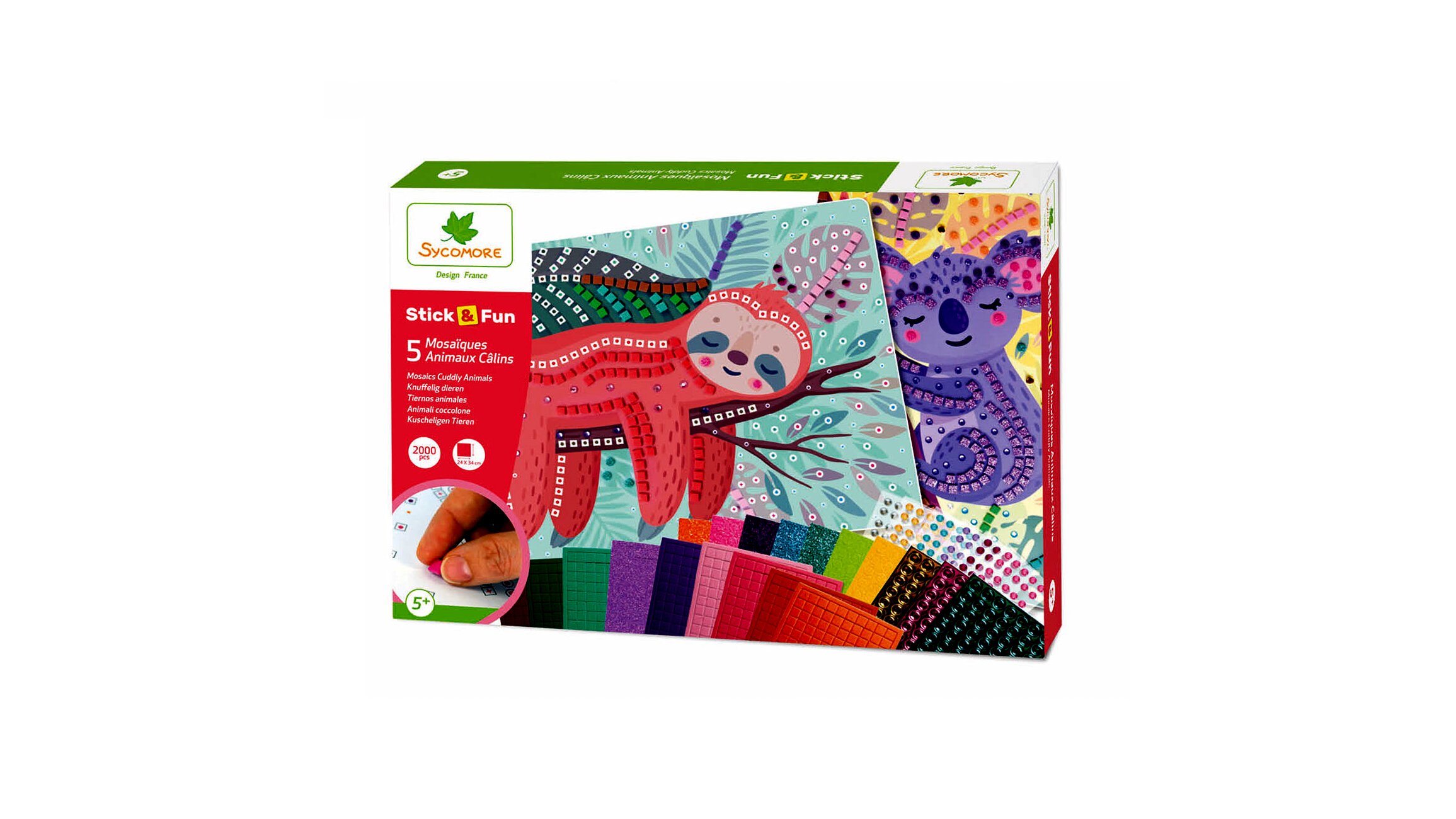 A Sycomore Stick 'n fun mozaikkép készítő szettel 5 darab ölelnivaló állatkás képet készíthetnek el a kreatív gyerekek. A kicsiknek is biztos sikerélmény, ugyanis a használata egyszerű: mindössze rá kell ragasztani a különböző mozaiklapocskákat a megadott helyekre, hogy kidekorálják az állatokat.