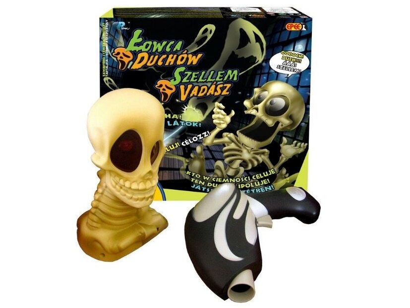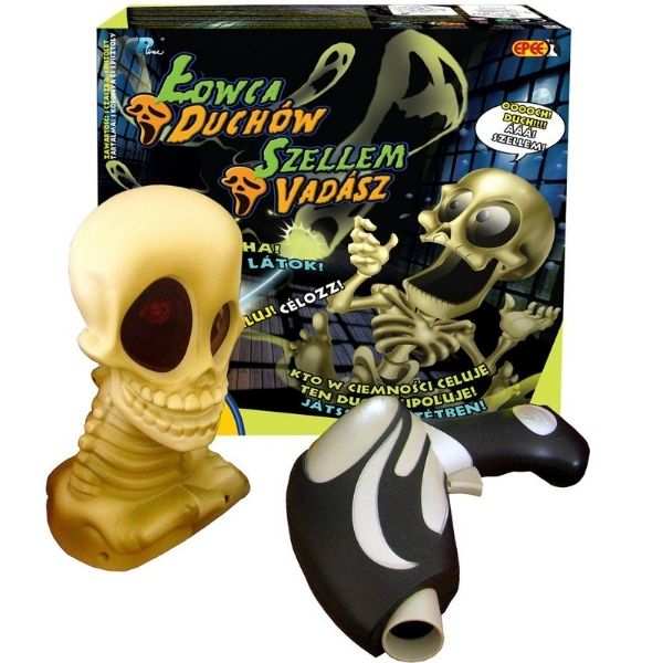 Keltsd életre a koponyát, és tárazd be a pisztolyod, mert szellemek fogják megszállni a szobádat. A koponya körbe-körbe forog, és nézelődik, miközben csúf kísérteteket vetít a falra. A szellemek csak pillanatokra fognak megjelenni, így minél gyorsabban és pontosabban kell céloznod, hogy te lehess a szellemvadász! A játékot kísérteties sikolyok teszik még hátborzongatóbbá! A játék nagyon jól fejleszti a memóriát is, a játékosokat gondolkodásra, memorizálásra serkenti.Doboz mérete: 25 x 25 x 11 cm