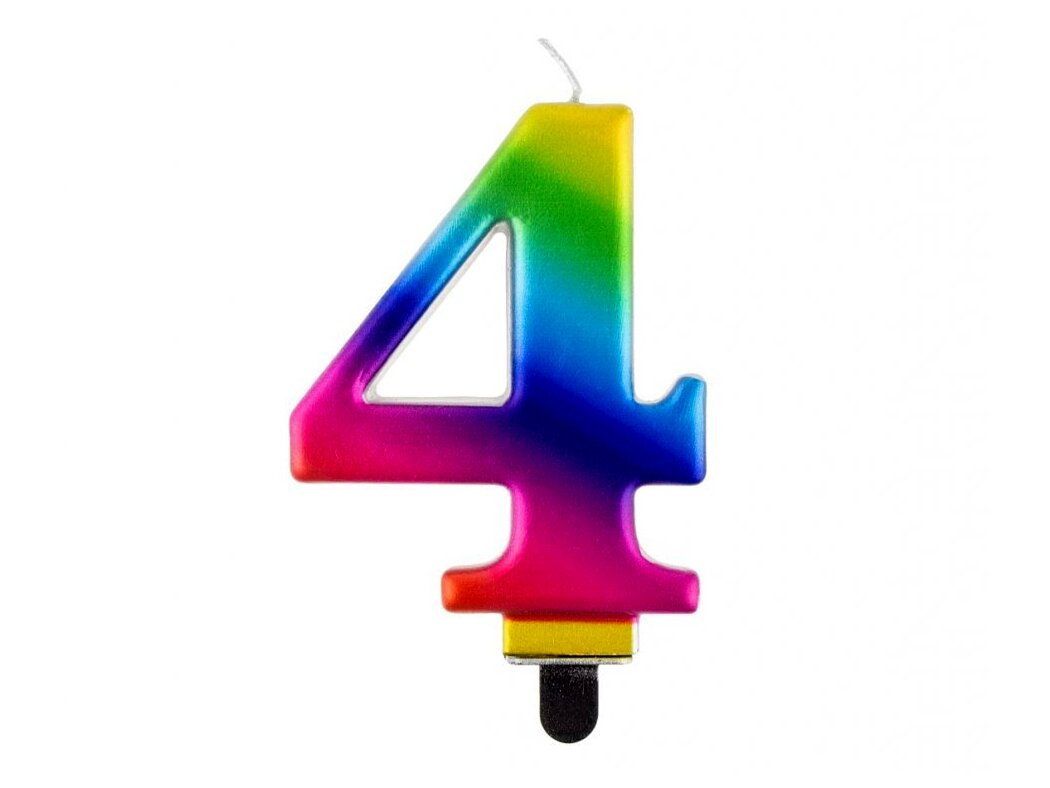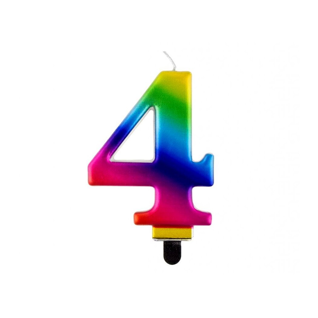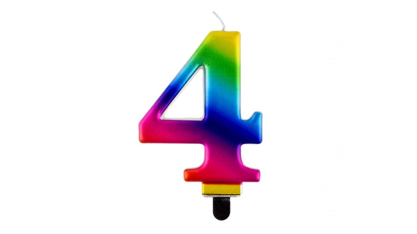 A varázslatos szivárvány színben pompázó, 4-es számot ábrázoló születésnapi gyertya a legszebb kiegészítője lehet a buliknak ha valami különlegességre vágyunk.