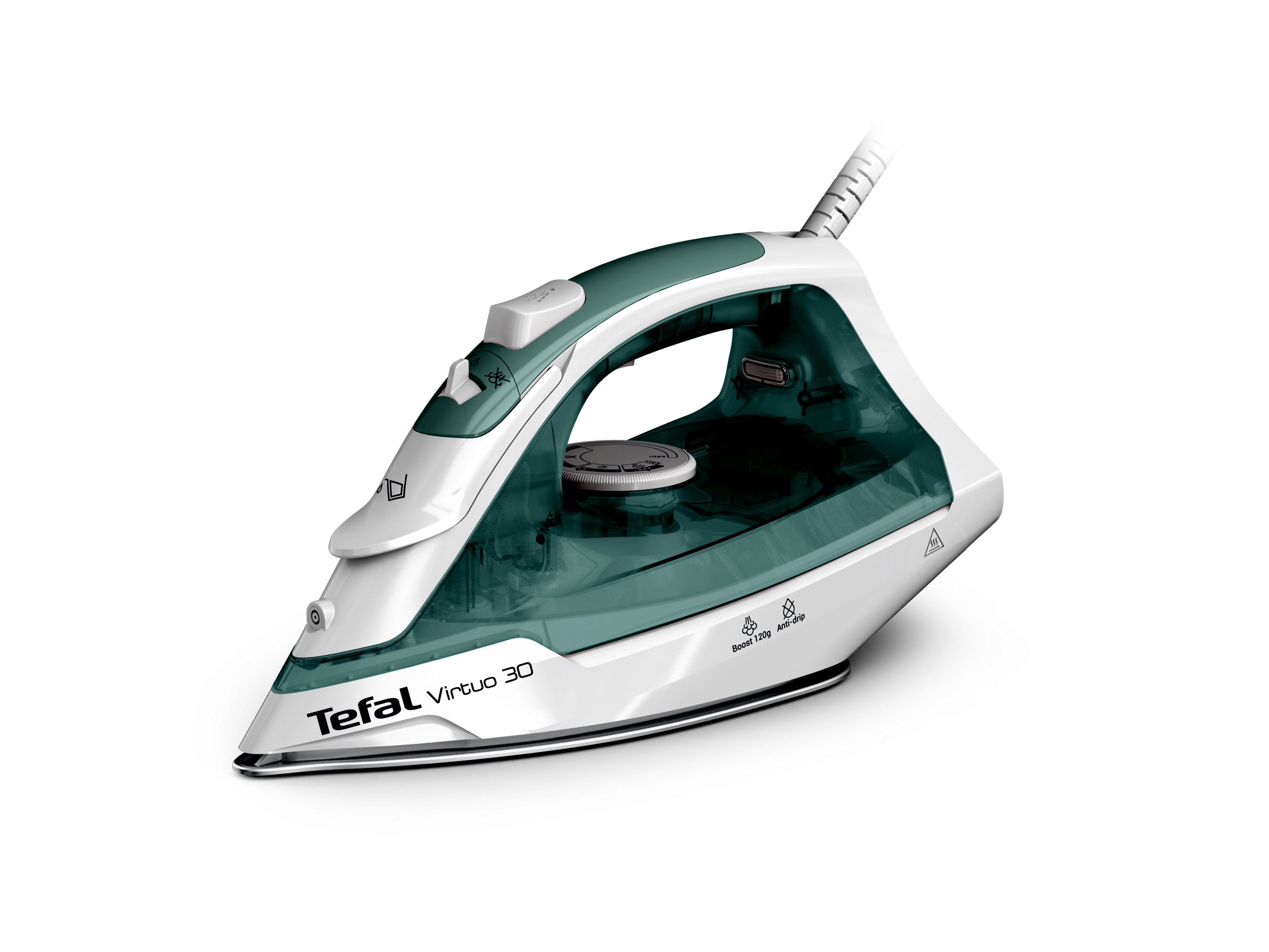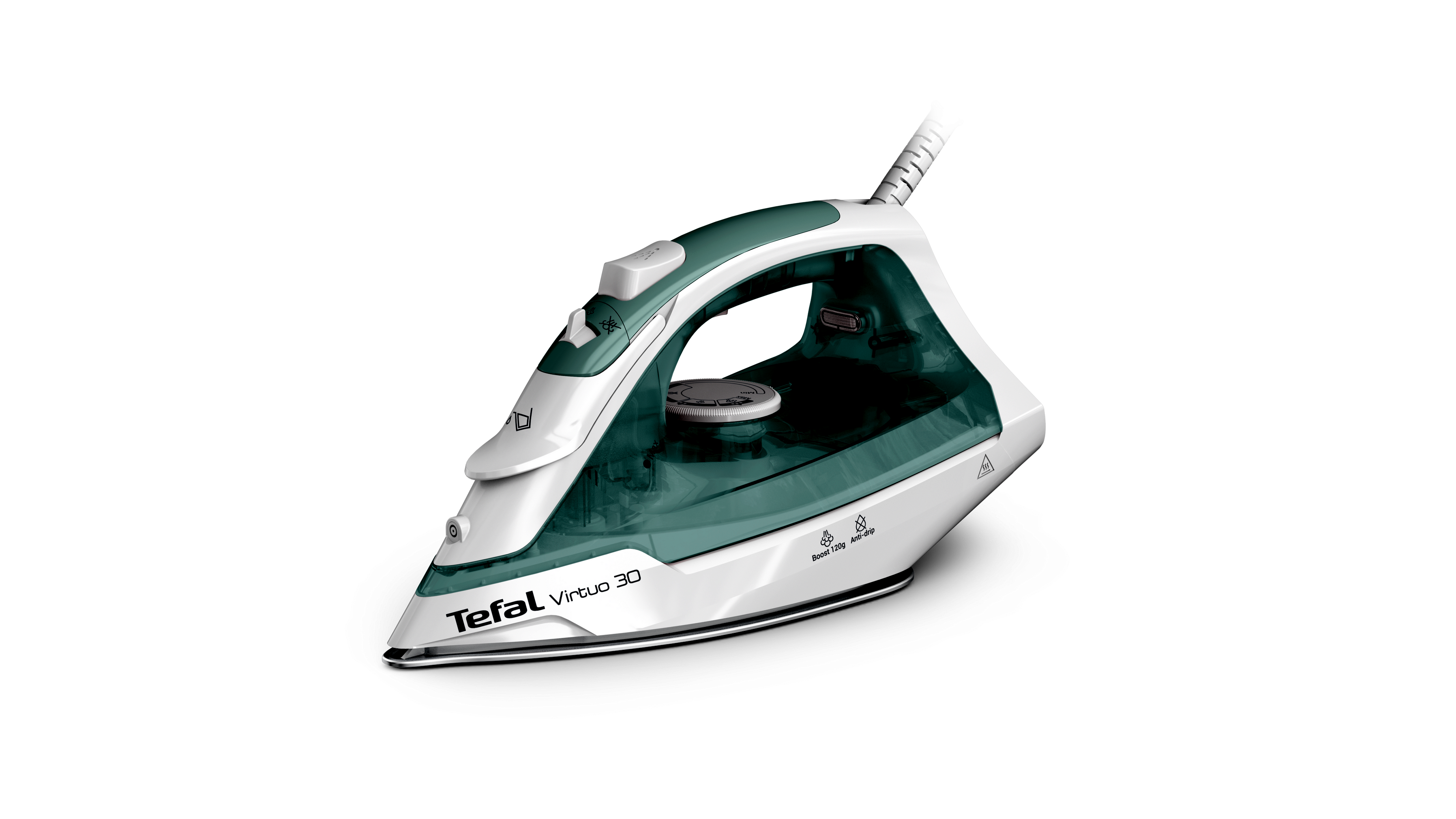 A Tefal Virtuo 30 egy nagy teljesítményű, mindennapi használatra tervezett gőzölős vasaló, amely gyors felmelegedéssel, folyamatos gőzkibocsátással és erős gőzlökettel segít a gyűrődések hatékony kisimításában, akár vastagabb anyagokon is.