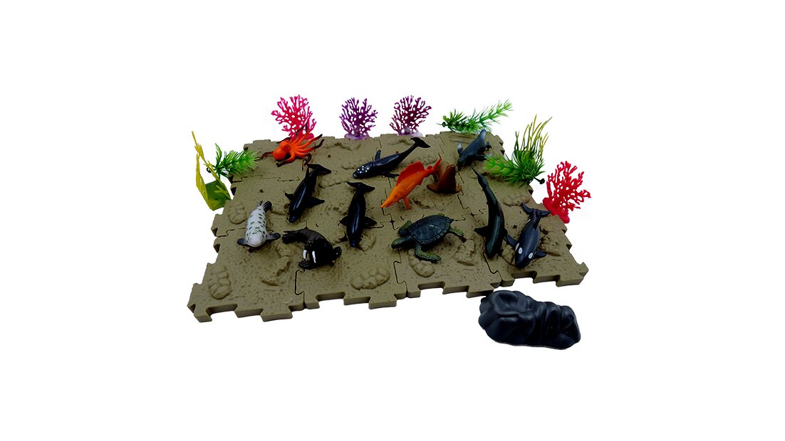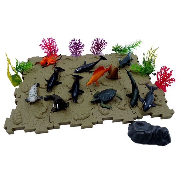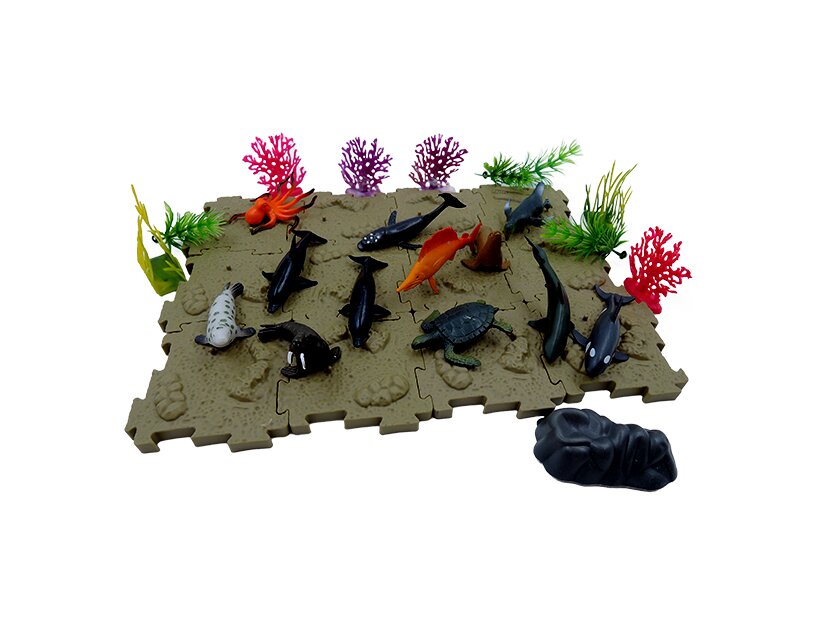 - Tartalom: 12 db tengerfenék tábla fosszíliákkal, 4 db korall (2 rózsaszín, 2 lila), 6 db aljnövényzet (2 féle), 1 db szikla, 12 db különböző tengeri állat.