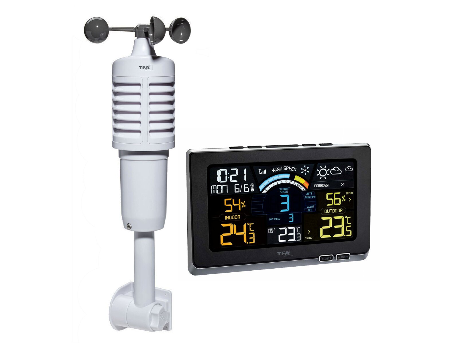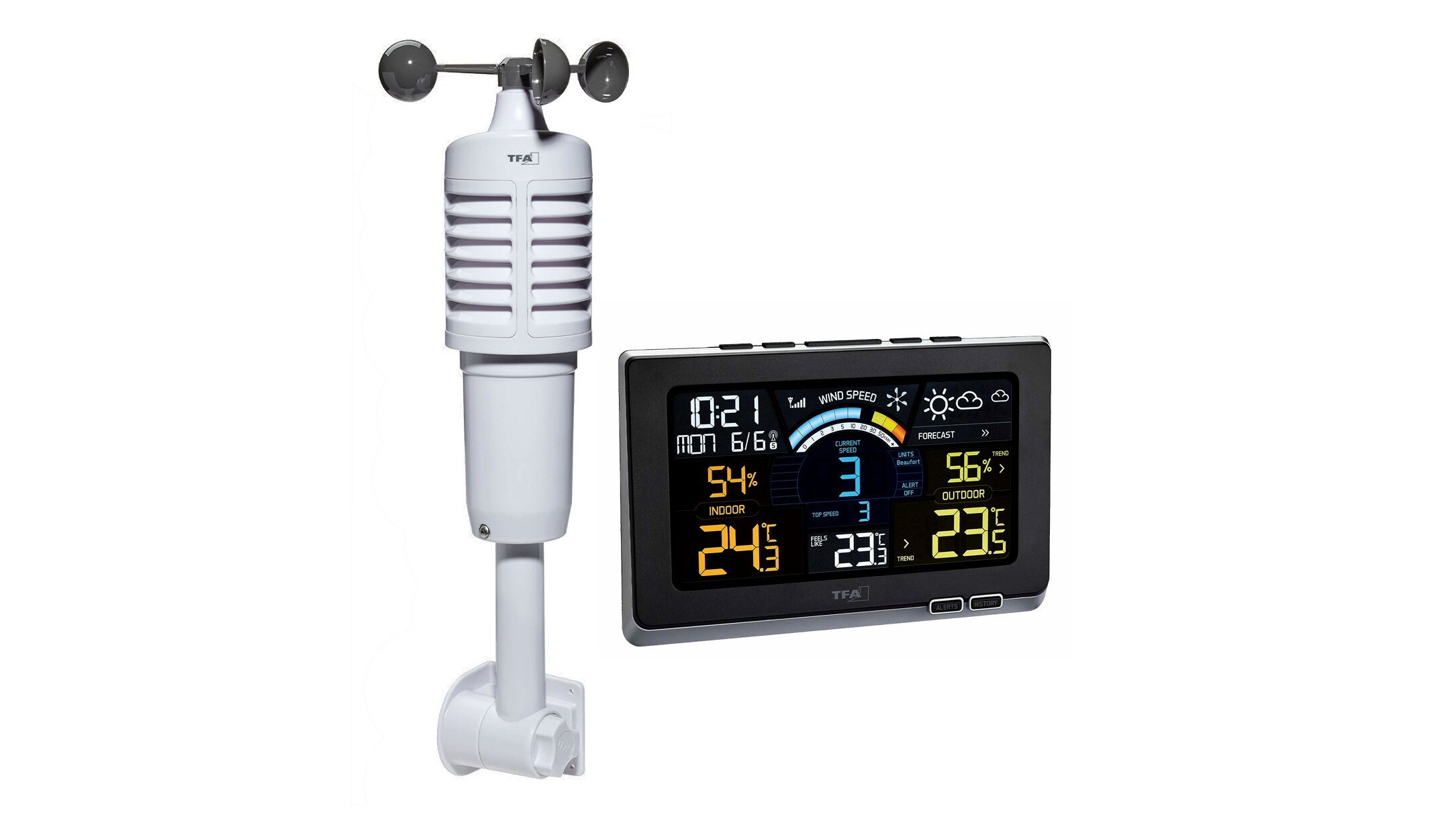 A rádiós meteorológiai állomással mindig látható az aktuális időjárás. Az időjárási adatokat vonzóan animálja a színes megvilágítású kijelző. 2 fényerősség mellett a színes kijelző nagyon könnyen olvasható. A külső hőmérsékletet, a páratartalmat és a szélsebességet vezeték nélkül továbbítja a kijelzőre. Az esőtől és a naptól való védelem érdekében a kültéri érzékelő időjárásálló házban van.Műszaki adatok