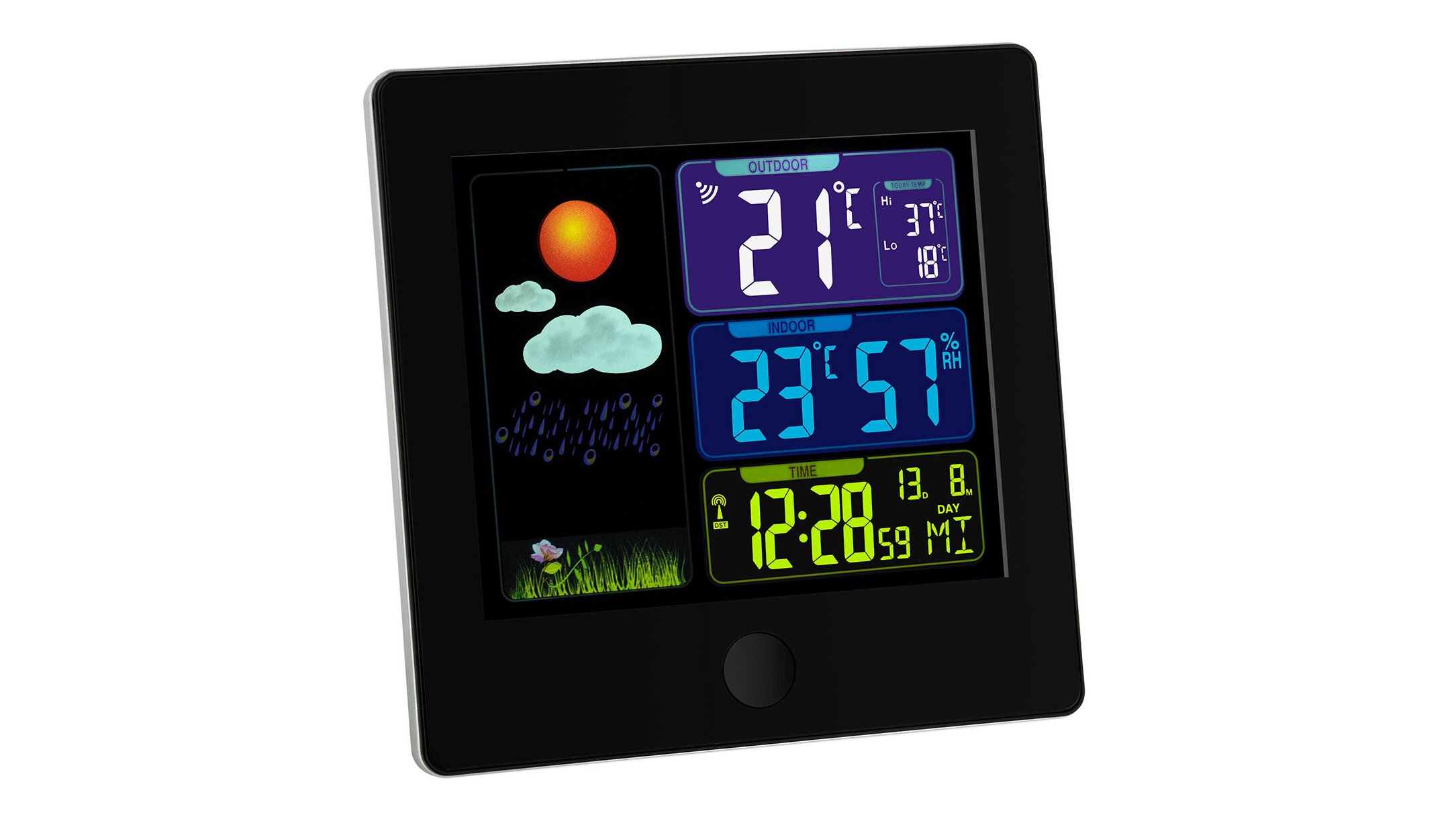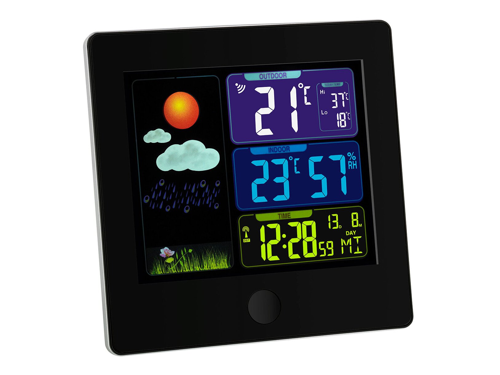 A színesen megvilágított kijelző tavaszi hangulatot teremt. A helyi kültéri hőmérsékletet és a légnedvességet saját vezeték nélküli adó továbbítja, a helyiség klímát belső érzékelők mérik.