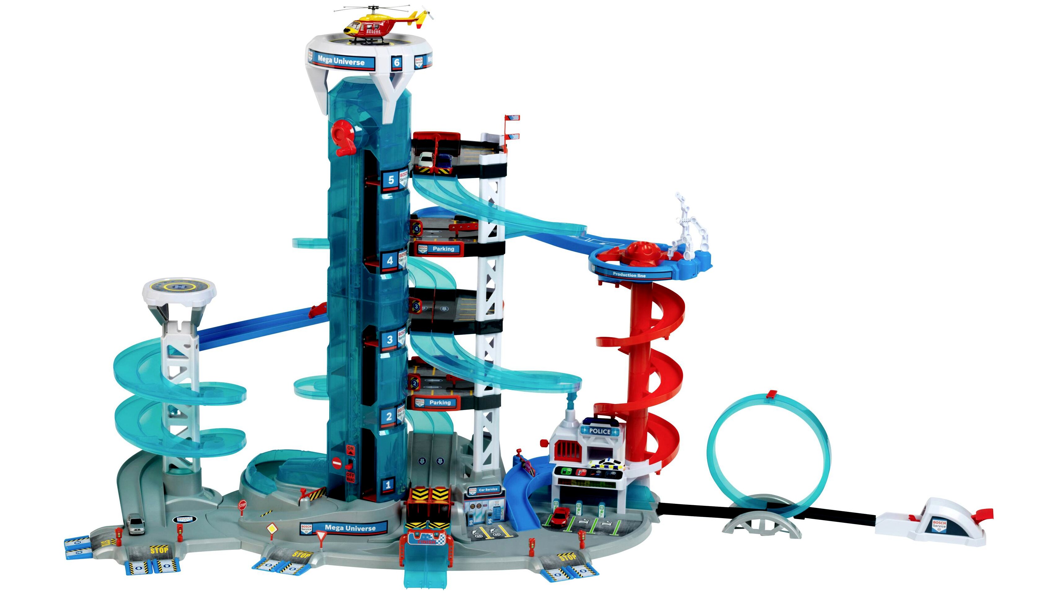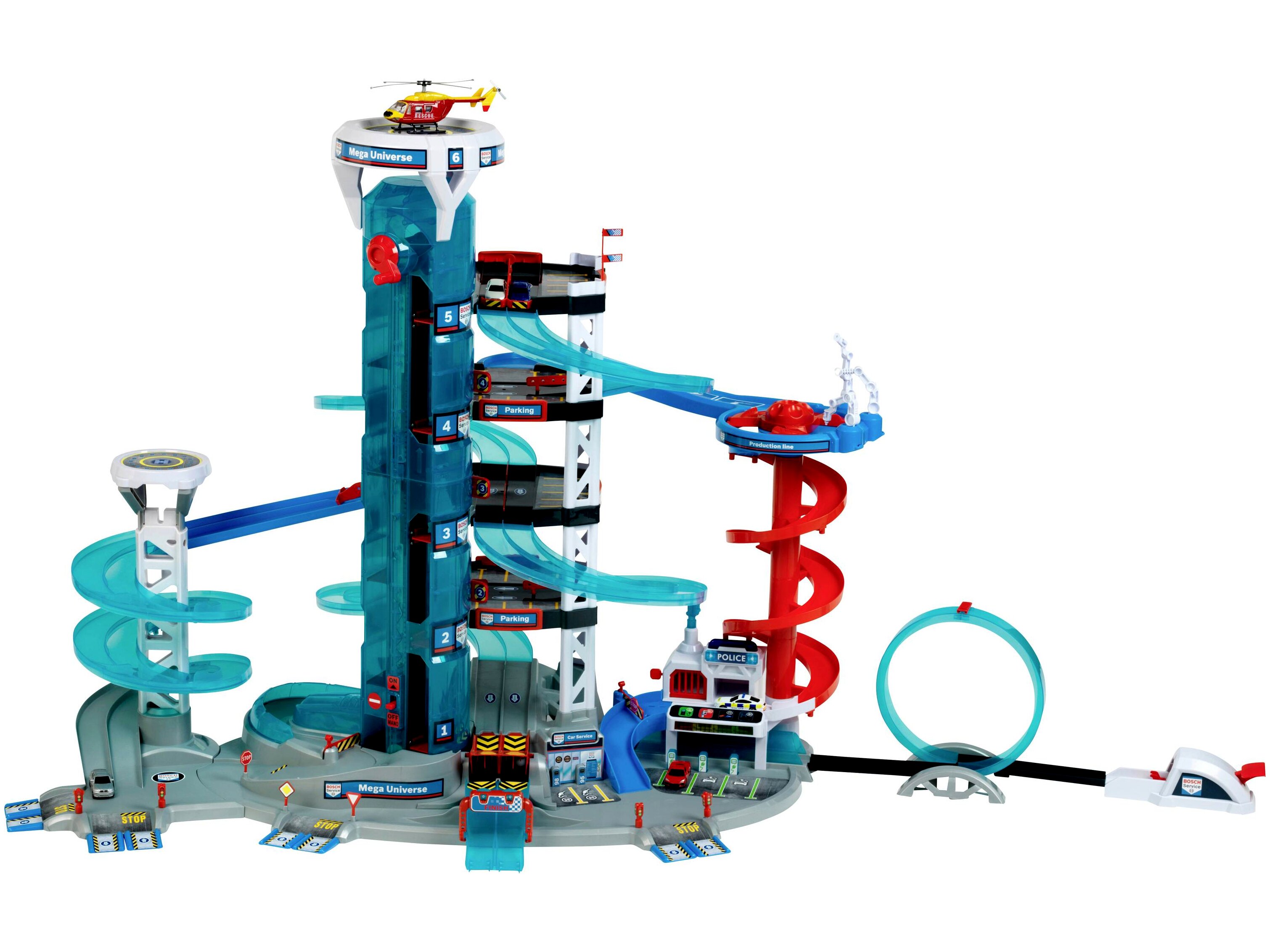 Ez a maga nemében a legnagyobb parkolóház öt szinttel, parkolóhelyekkel, két sávos versenyekkel és számos extrával: manuálisan működtethető elektronikus páternoszter lifttel, hurokkal ellátott katapulttal, alagúttal és félcsővel. Egy forgó giroszkóp mechanikus robot gyártósorral és az azt követő orsótorony-ereszkedéssel szintén hozzájárul a gyors tempójú szórakozáshoz. Van még egy elektronikus pilótafülke elektromos töltőállomással, egy helikopter-leszállópálya, egy rendőrőrs zárható börtöncellával és egy sebességmérő kamera – mindegyikhez illő, klassz fény- és hangeffektek tartoznak. A bárhová rögzíthető síugrósánc és leszállópálya, a körszámlálóval ellátott célvonal és az öt darab 1:64-es méretarányú jármű is különösen szórakoztató.