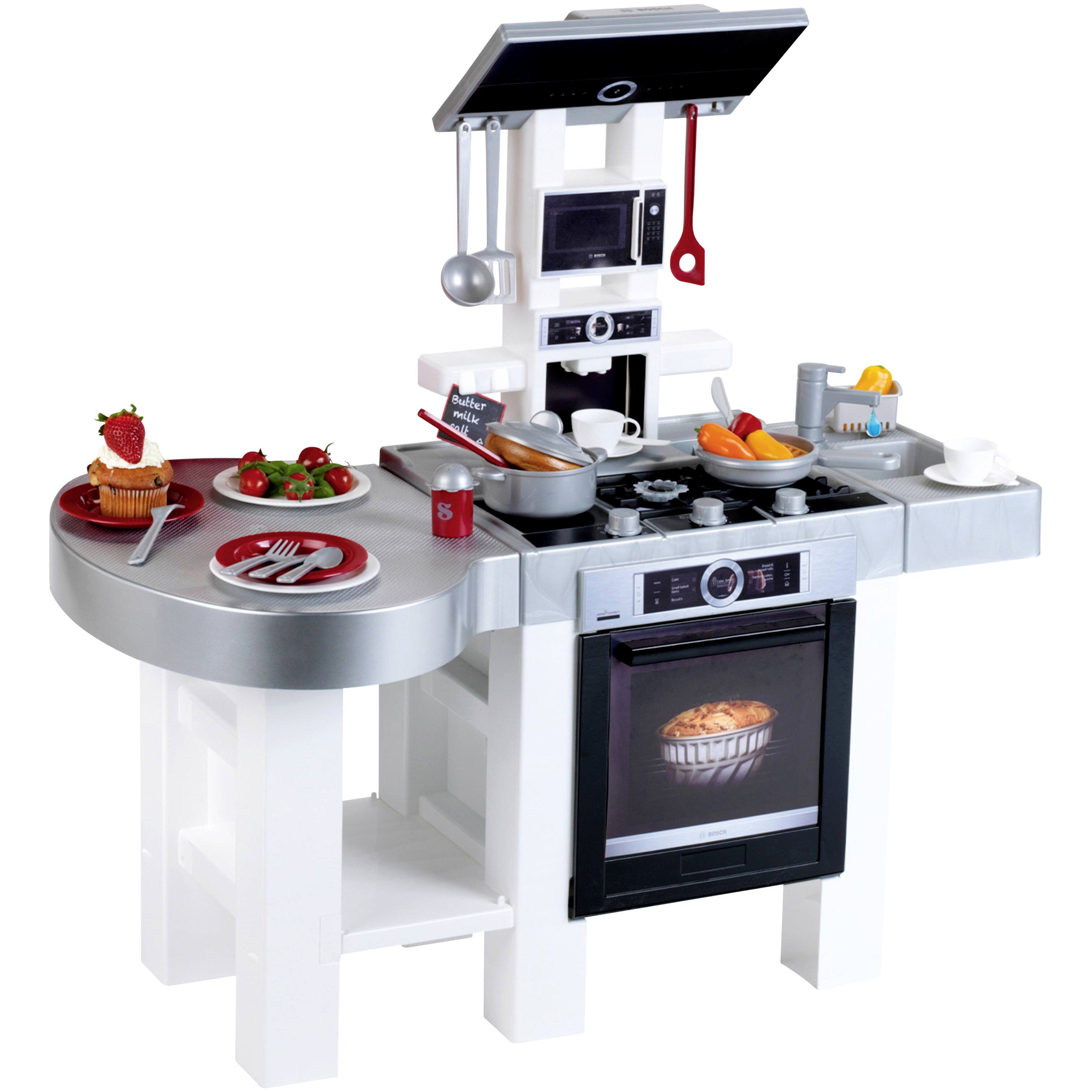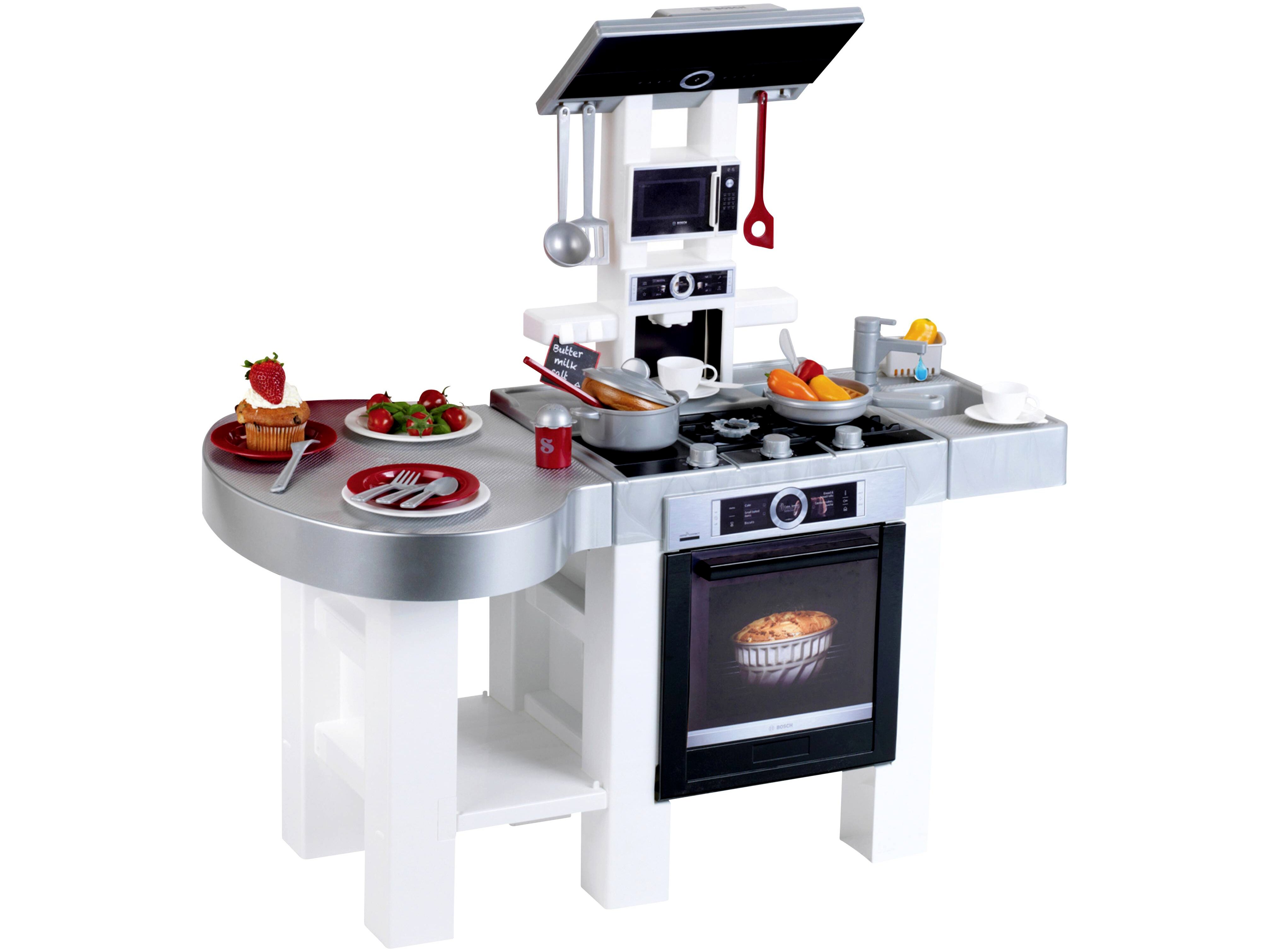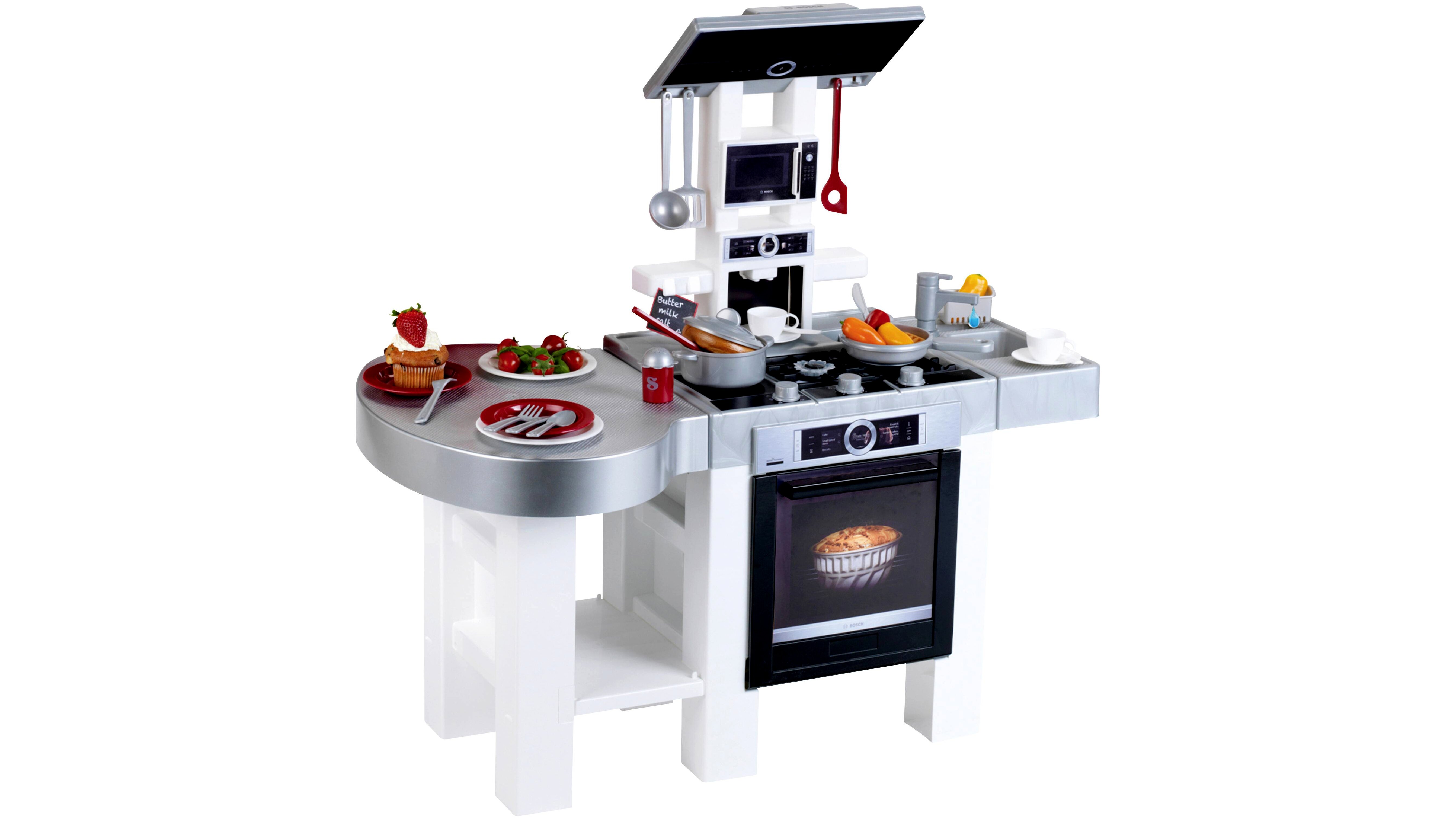 A Bosch formatervezésű modern konyha Németországban készül, és mindkét oldalról használható. A számos játéklehetőség mellett számos kiegészítőt is kínál: elektronikus főzőhangokkal és beépített fénymodullal ellátott főzőlapokat, hangfunkcióval ellátott kávéfőzőt és pumpás csapteleppel ellátott mosogatót. Praktikus tárolási lehetőségek és a tűzhely felett páraelszívó található. Annak érdekében, hogy a gyerekek változatos, játékos főzési tevékenységekben részesülhessenek ebben a stílusos gyerekkonyhában, egy serpenyő, egy fedővel ellátott fazék és praktikus edények is rendelkezésre állnak. Ez tartalmaz egy spatulát, 2 fakanál és egy só- és borsszórót. Van egy két személyes étkezőgarnitúra is, amely egy tányérból és egy levesestányérból, valamint egy villából, késből és kanálból áll, és 2 eszpresszókészlet, amely egy csészéből, egy csészealjból és egy kávéskanálból áll.