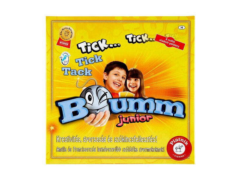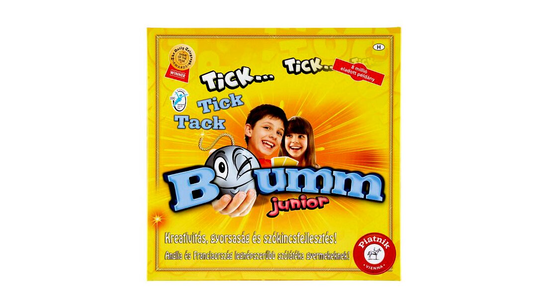 A Tick Tack Bumm! Junior egy kreatív szókincsfejlesztő játék gyerekeknek. Alapja a Tick Tack Bumm! Original elnyerte az Év játéka díjat Angliában, Franciaországban és Dániában is.Fordítsátok fel egy kártyát, alaposan nézzétek meg a képet, majd indítsátok el a Tick Tack Bummot! Senki sem tudja, hogy mennyi ideig ketyeg és kinek a kezében lesz, amikor elhangzik a Bumm! Ezért mondjatok gyorsan egy szót a képről és passzoljátok tovább az időmérőt! Ha ügyesek vagytok és elég gyorsan tudtok új szót mondani, akkor nem nálatok lesz az időmérő, amikor elhangzik a Bumm, mert akinél ekkor van, az sajnos büntetésül kap egy kártyát. Az nyer, akinek a játék végén a legkevesebb kártyája marad.