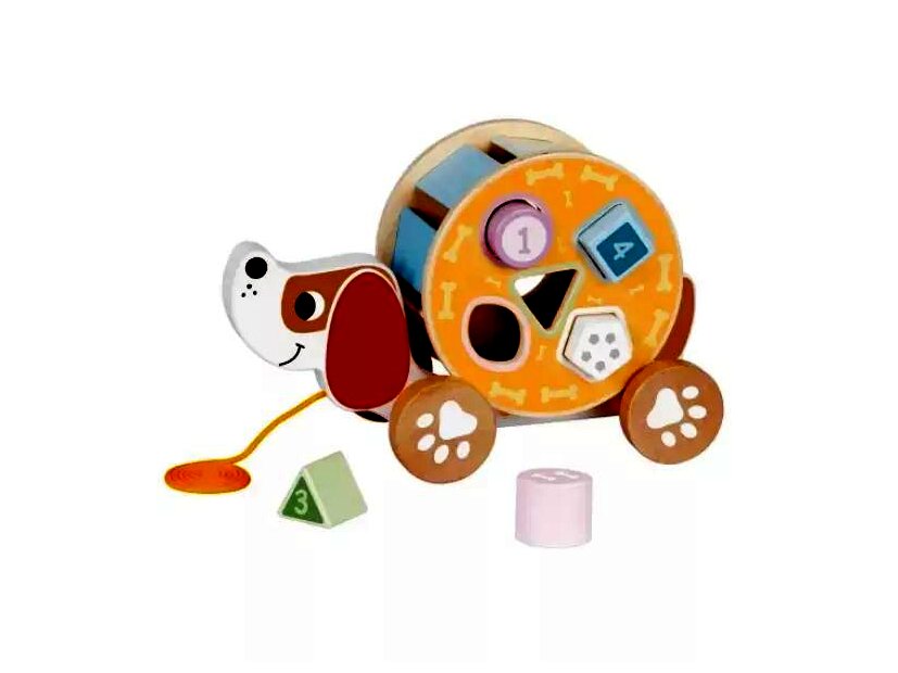 Tartalom: 1 db fa húzható kutyus, 7 db színes forma