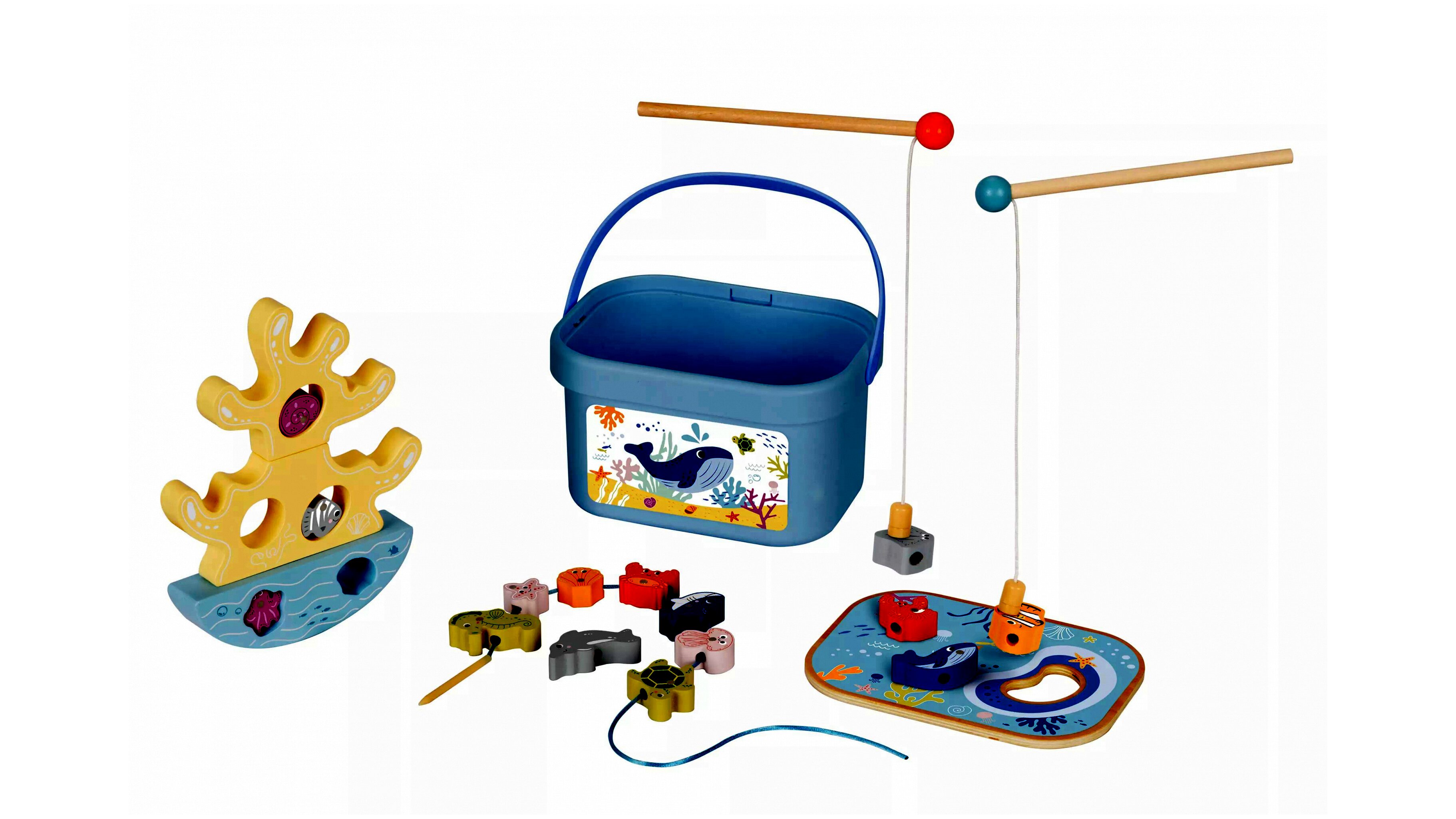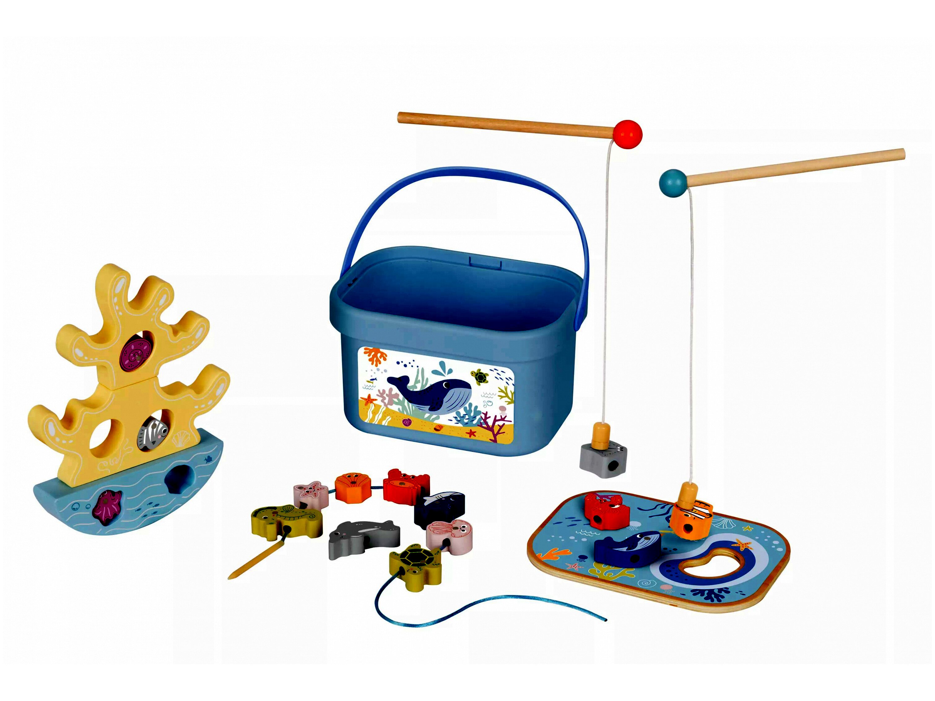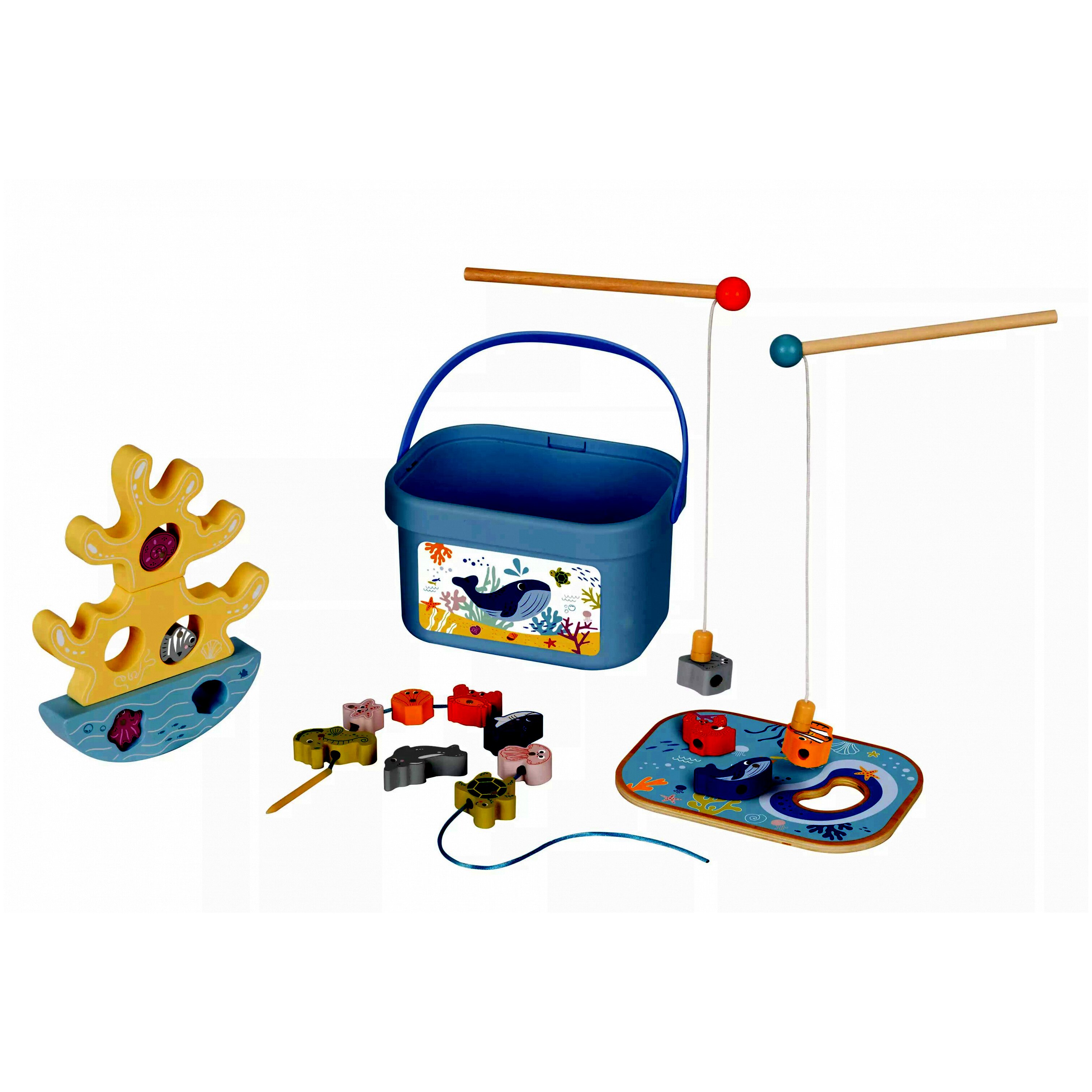 A játék három különböző tevékenységet kínál: mágneses horgászatot, gyöngyfűzést és egyensúlyozó játékot. A tengerparti tematikájú színes elemekkel a gyerekek úgy érezhetik, mintha a tengerparton játszanának.A készlet 15 erős mágneses óceáni állatottartalmaz, amelyeket a gyerekek kifoghatnak a két mágneses horgászbottal. A színes gyöngyökkel való játék segíti a kézügyesség és a szem-kéz koordináció fejlesztését. Az egyensúlyozó korall játék nagyszerű szórakozást nyújt, miközben a finommotorikus készségeket fejleszti.