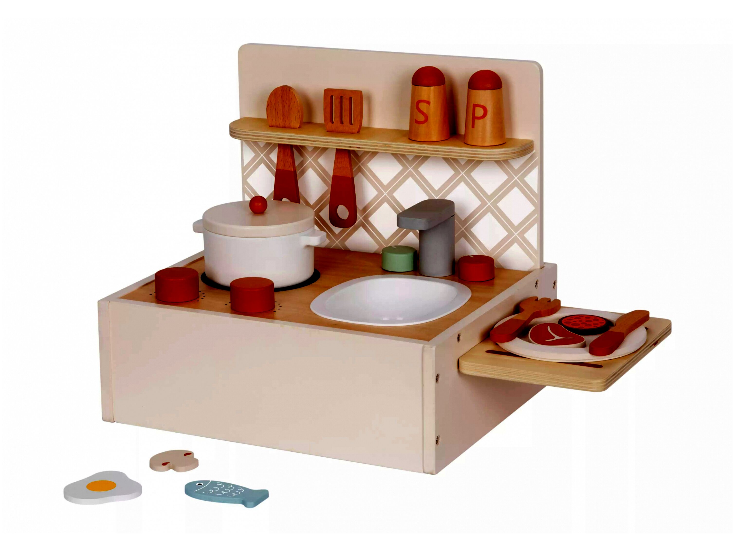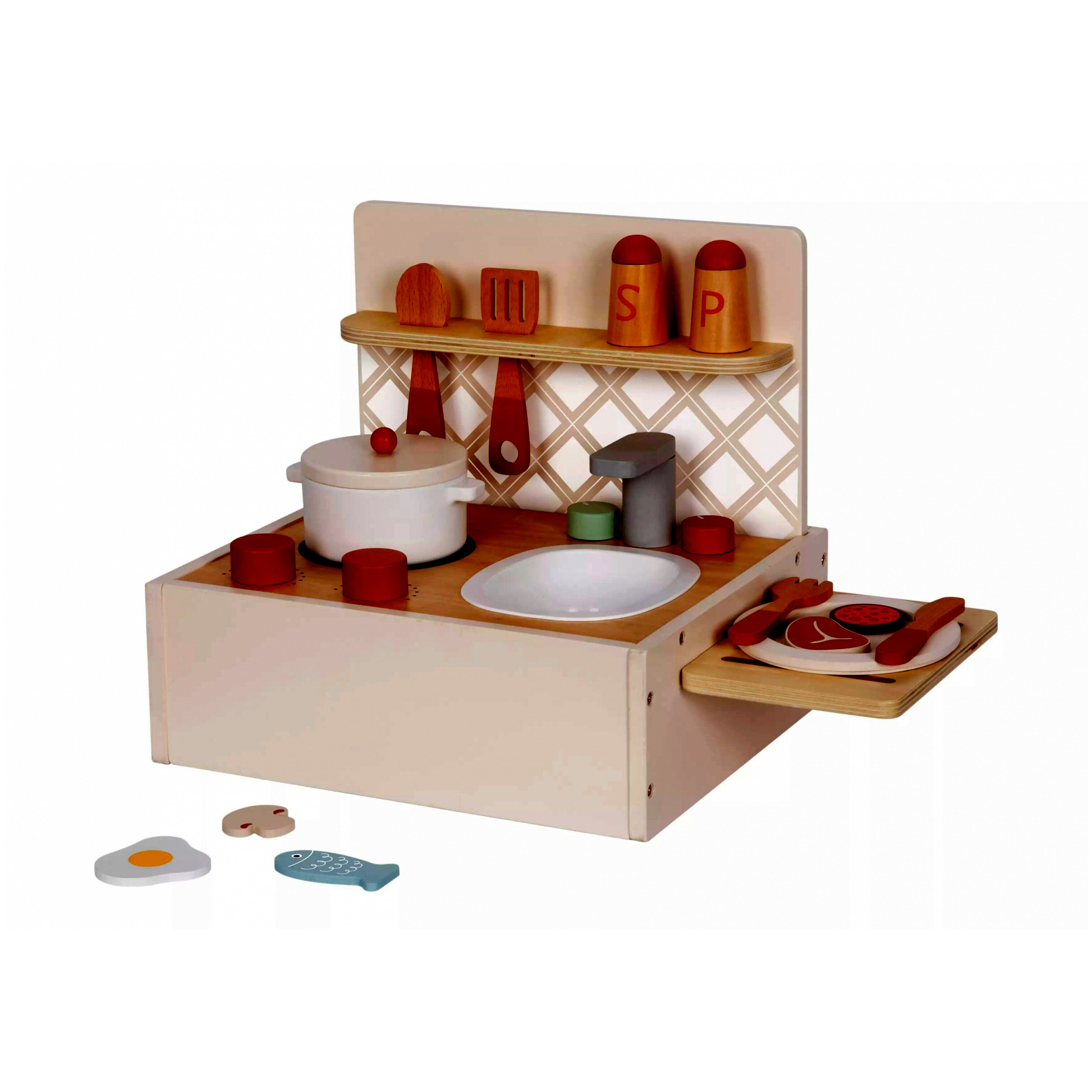 A készlet tartalmaz egy kisméretű konyhapultot, amelyen főzőlap, mosogató és polc is található. A különböző kiegészítők, mint a fazék, tányér, evőeszközök, fakanalak és különféle "élelmiszerek" mind-mind lehetőséget kínálnak a szerepjátékra és a fantázia fejlesztésére.A termék jellemzői:
