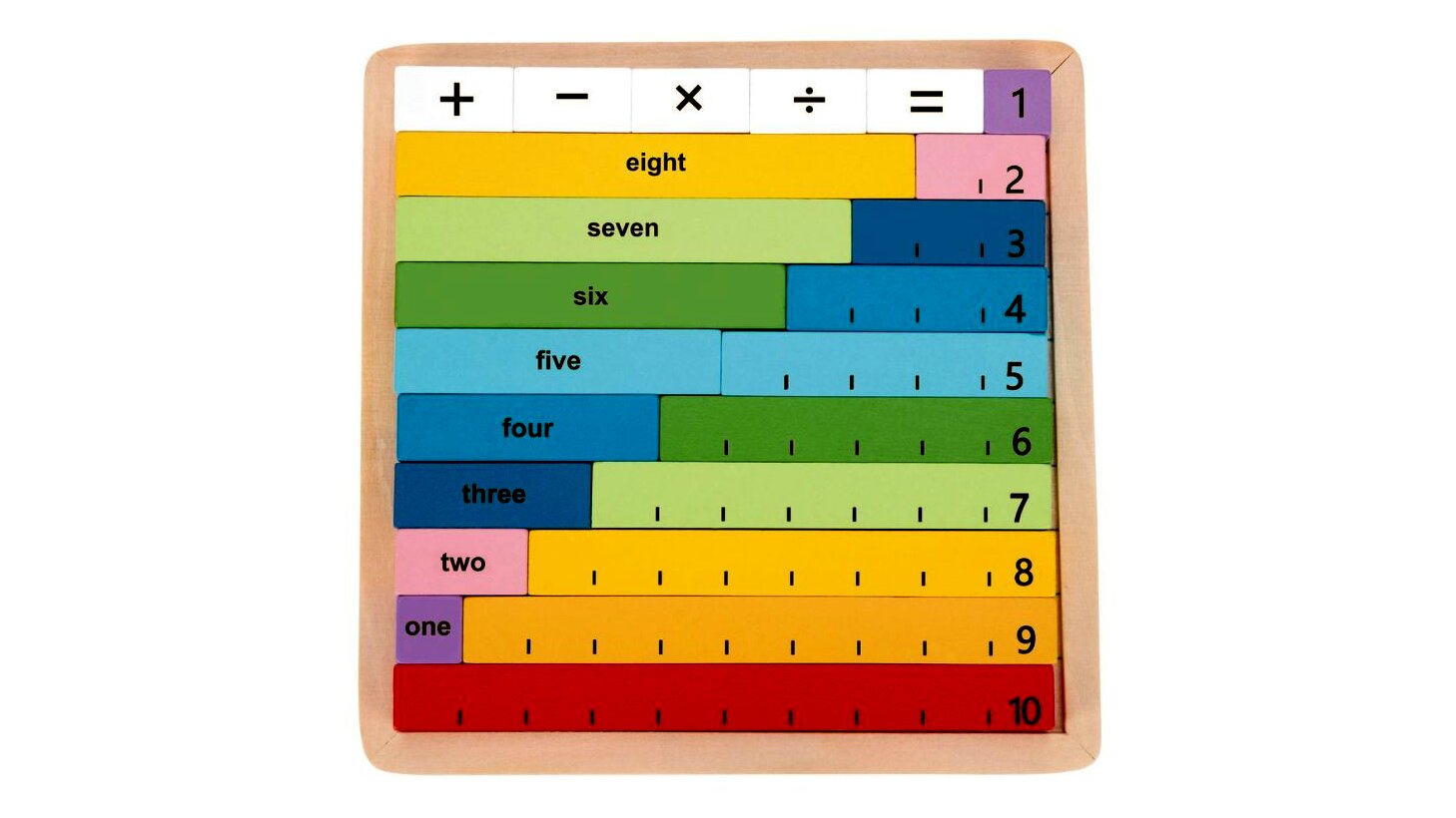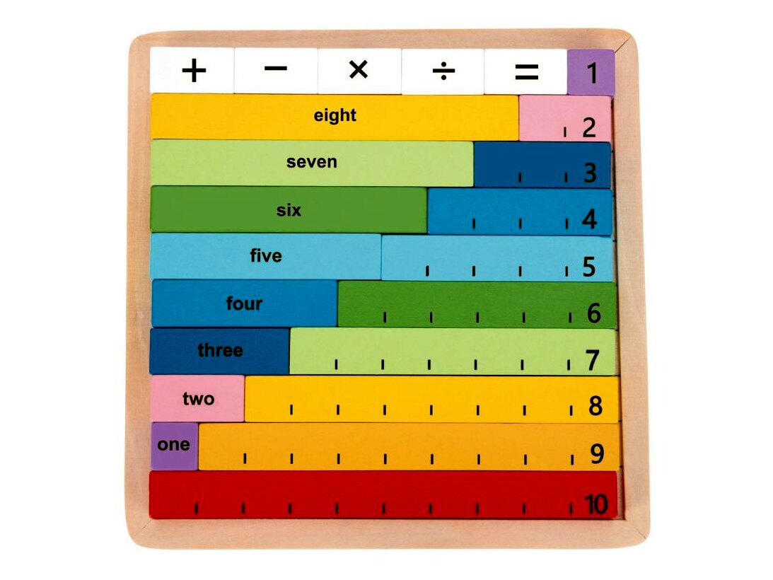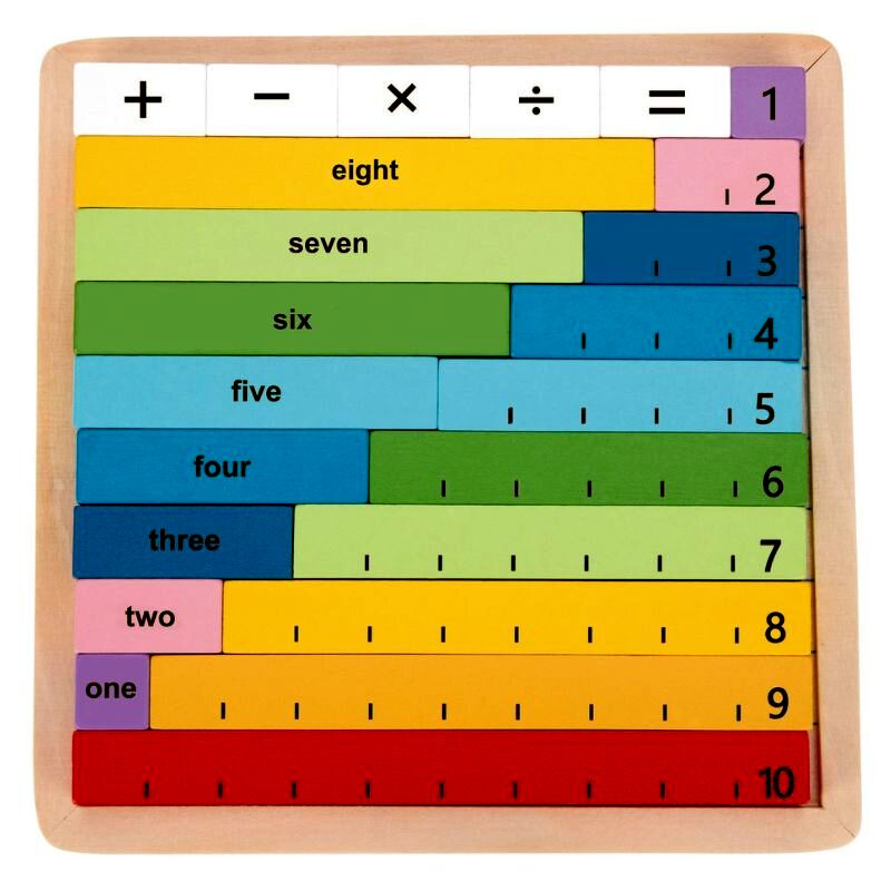 A dobozban 1-től 10-ig találhatók különböző színű, fából készült rudak, valamint a négy alapműveletet (összeadás, kivonás, szorzás, osztás) jelölő kis kockák, amelyekkel a gyerekek különböző műveleteket rakhatnak ki. A játékkockák egyik oldalán számok, másik oldalán a számok neve szerepel angol nyelven. A tárolóként szolgáló fa alaplapon minden rúdnak megvan a maga helye, így a gyerekek akár annak segítségével is gyakorolhatják a matematikai műveleteket.