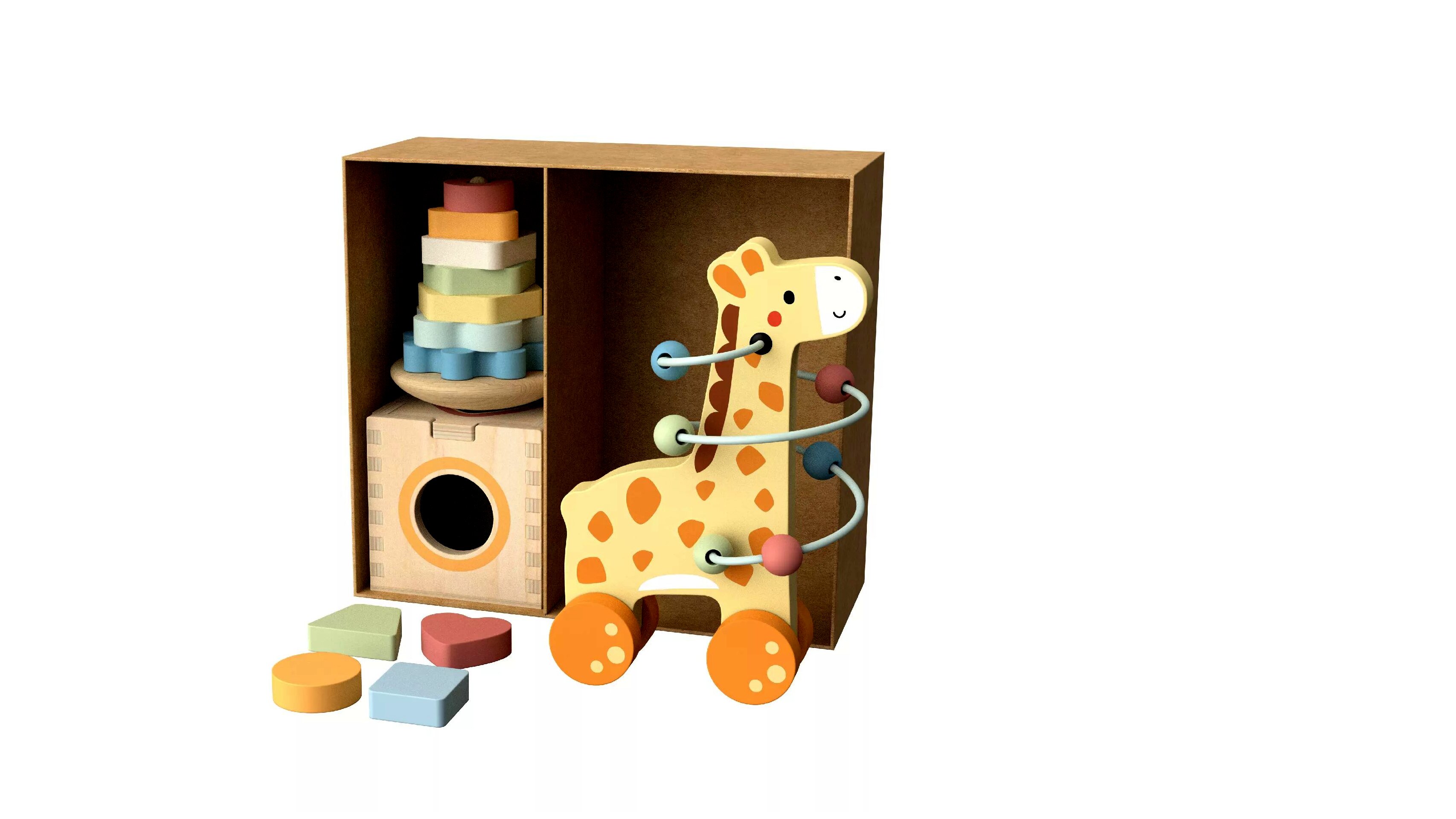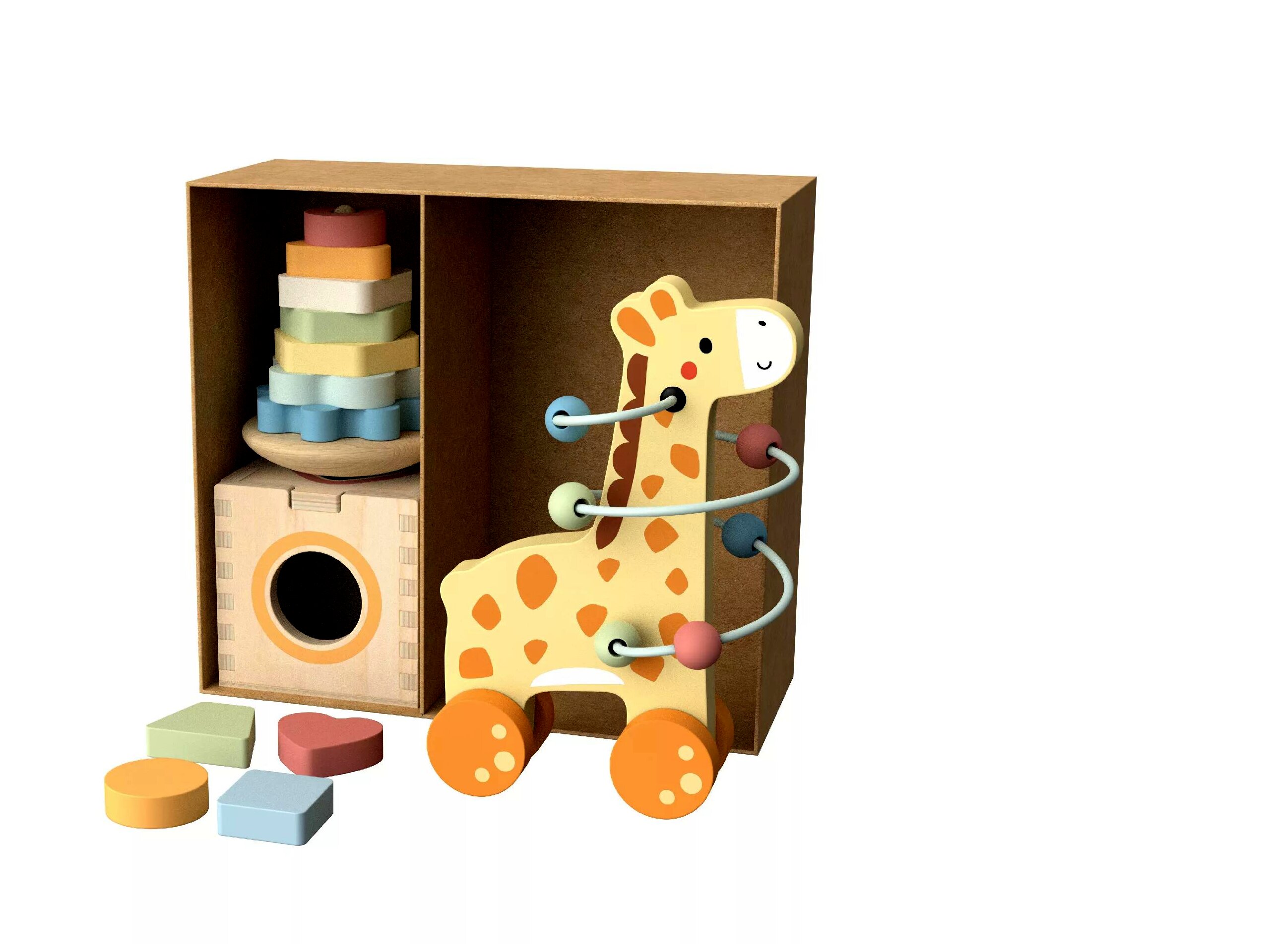 A készlet három izgalmas játékot kínál. Az egyik komponens egy formabedobó, amely segít a formák és színek felismerésében. A másik a toronyépítő, amely a kézügyességet és a türelmet fejleszti. A harmadik egy zsiráf alakú golyóvezető, amely a kézügyességet és a koncentrációt erősíti.