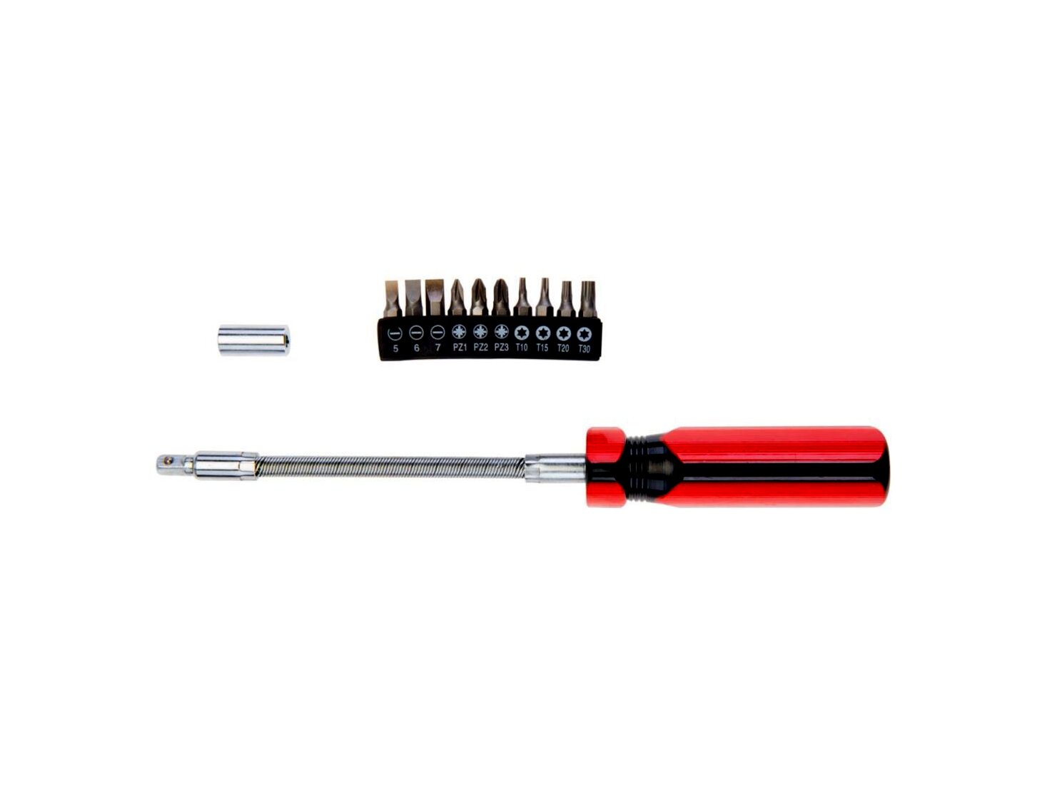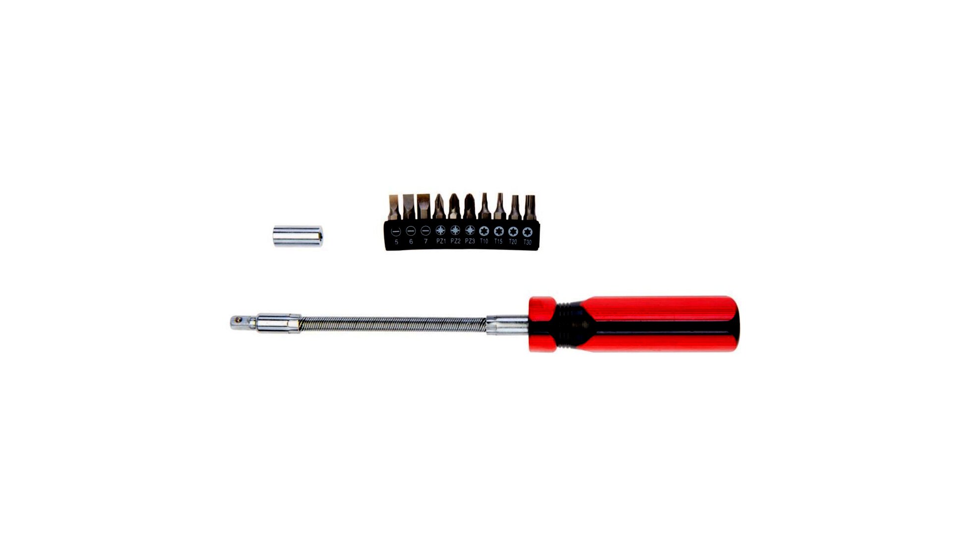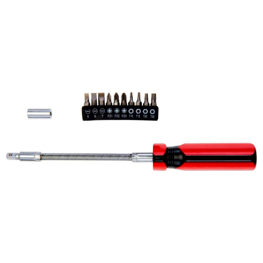 Csavarhúzó flexibilis szárral, 12 db-os klt., csavarhúzó markolat flexibilis szárral 250 mm, mágneses, adapter ¼” csavarhúzó bitekhez, 10 db csavarhúzó bit, méretek: lapos: 5 mm, 6 mm, 7 mm, kereszt: PZ1, PZ2, PZ3, Torx: T10, T15, T20, T30