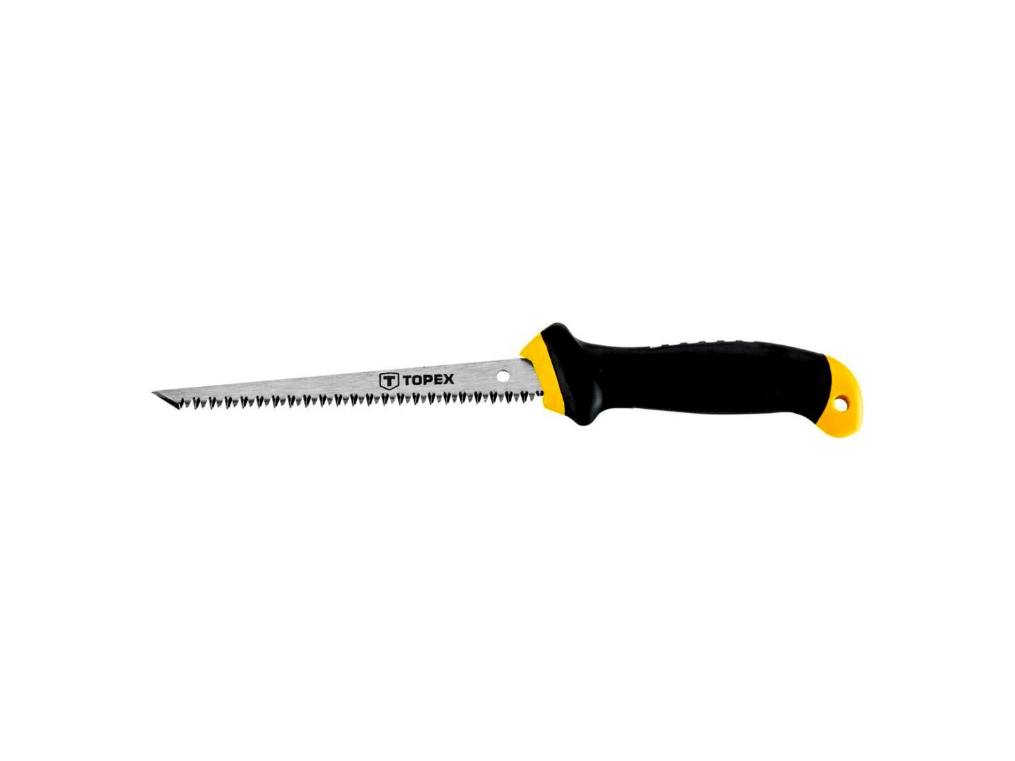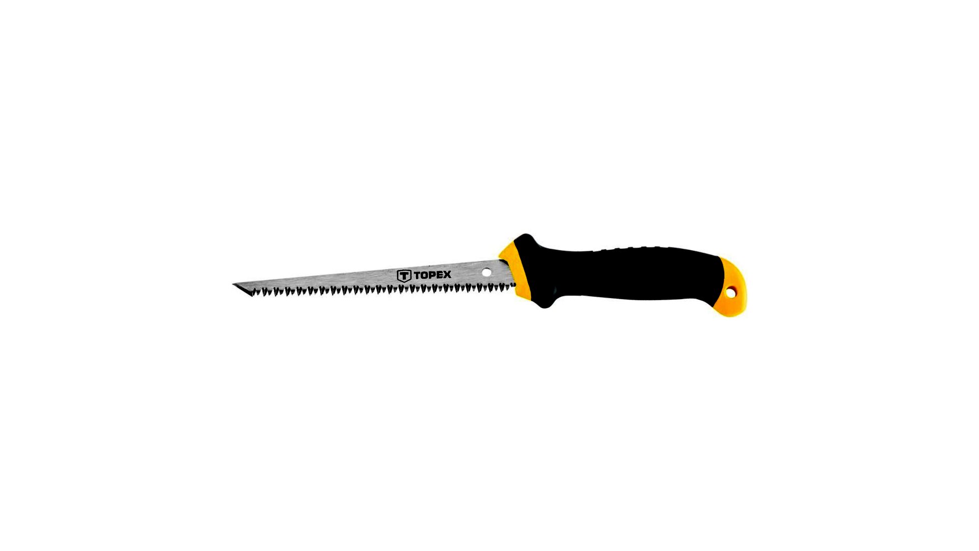 TOPEX gipszkarton fűrész. 150mm-es lappal. Vastagabb, keményebb a lapja, mint a többi fűrésznek, lyukak vágására szolgál gipszkarton lapokban. A fűrészlap kiváló minőségű edzett acélból készül. A fogak kétsíkú élezése csökkenti a vágási ellenállást. Az ergonómikus műanyag markolat segíti a precíz vezetést, a csúszásmentes bevonat pedig megakadályozza kicsúszását a kézből, jelentősen javítva a használati kényelmet. A TOPEX márka ezermestereknek készül.