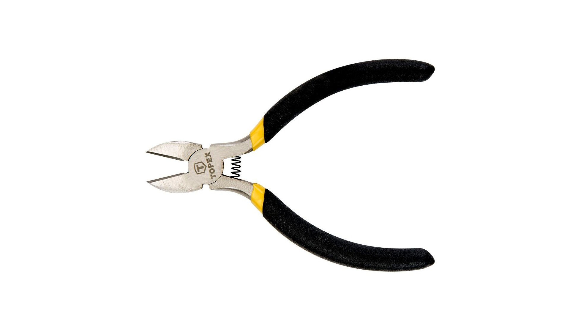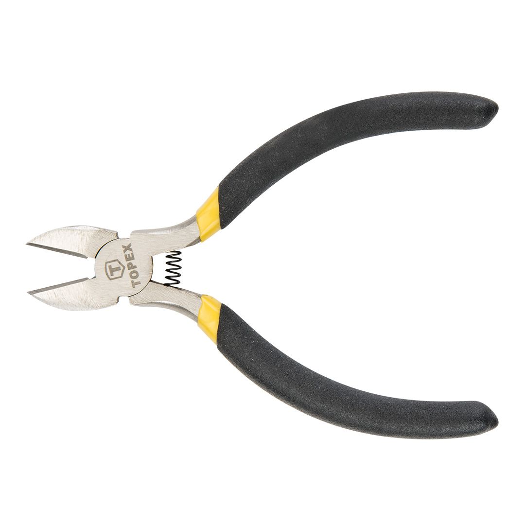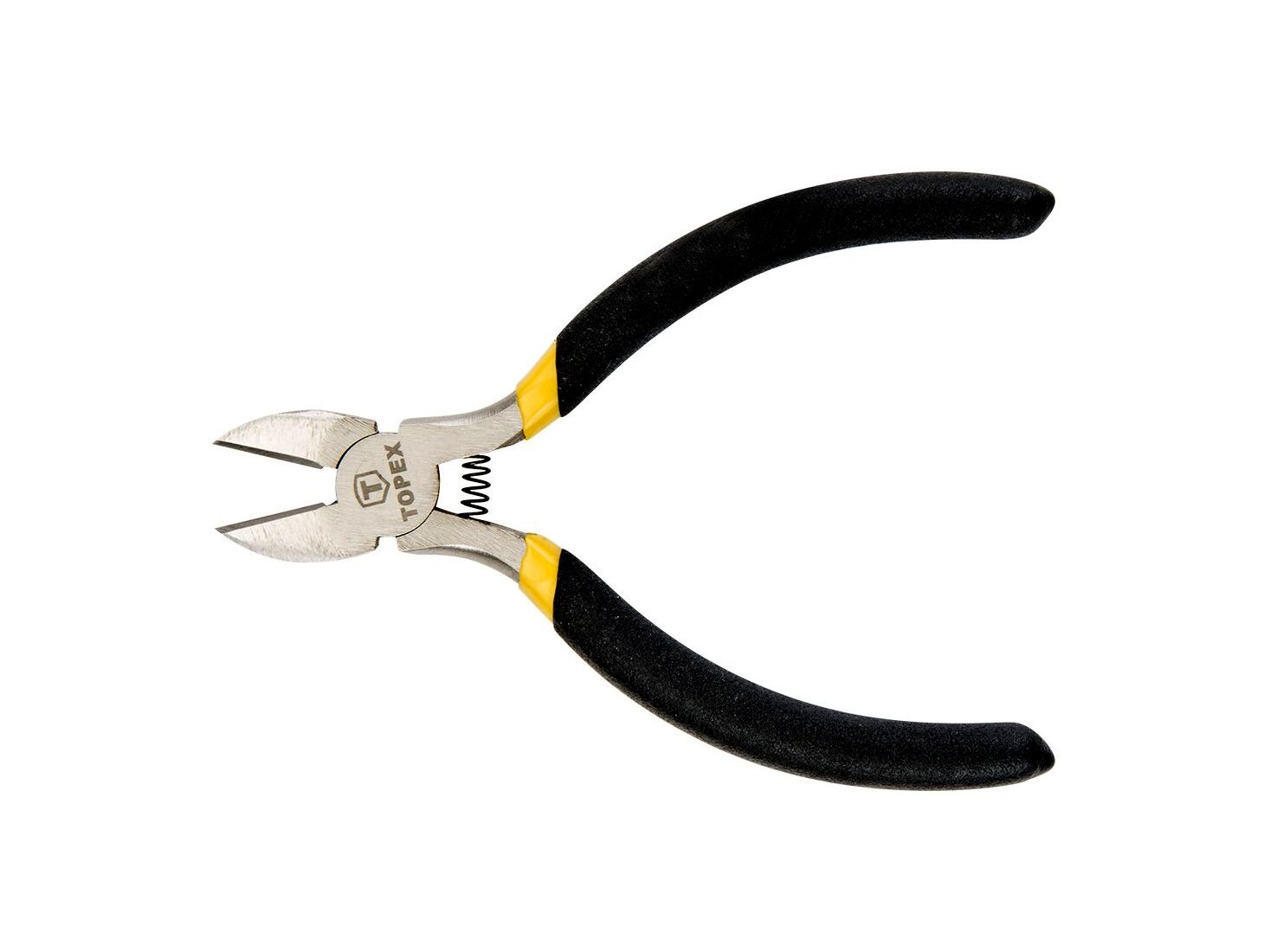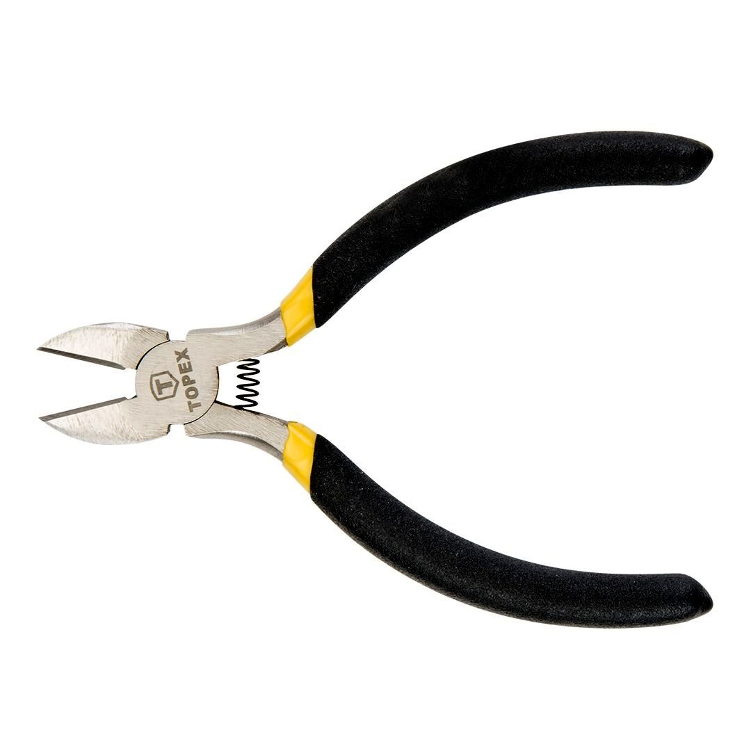 TOPEX 115 mm-es műszerész oldalcsípőfogó. Edzett acélból készült, a vágófelületek ezen kívül indukciós edzést is kaptak. Az ergonómikus, csúszásmentes anyaggal bevont markolat biztosítja a kényelmet és a biztonságot a munkavégzés során. A termék tökéletesen illeszkedik a kéz alakjához. A fogó a karok alaphelyzetbe visszaállását biztosító visszatérítő rugóval felszerelt, ami javítja a termék használati kényelmét. A TOPEX márka ezermestereknek készül.
