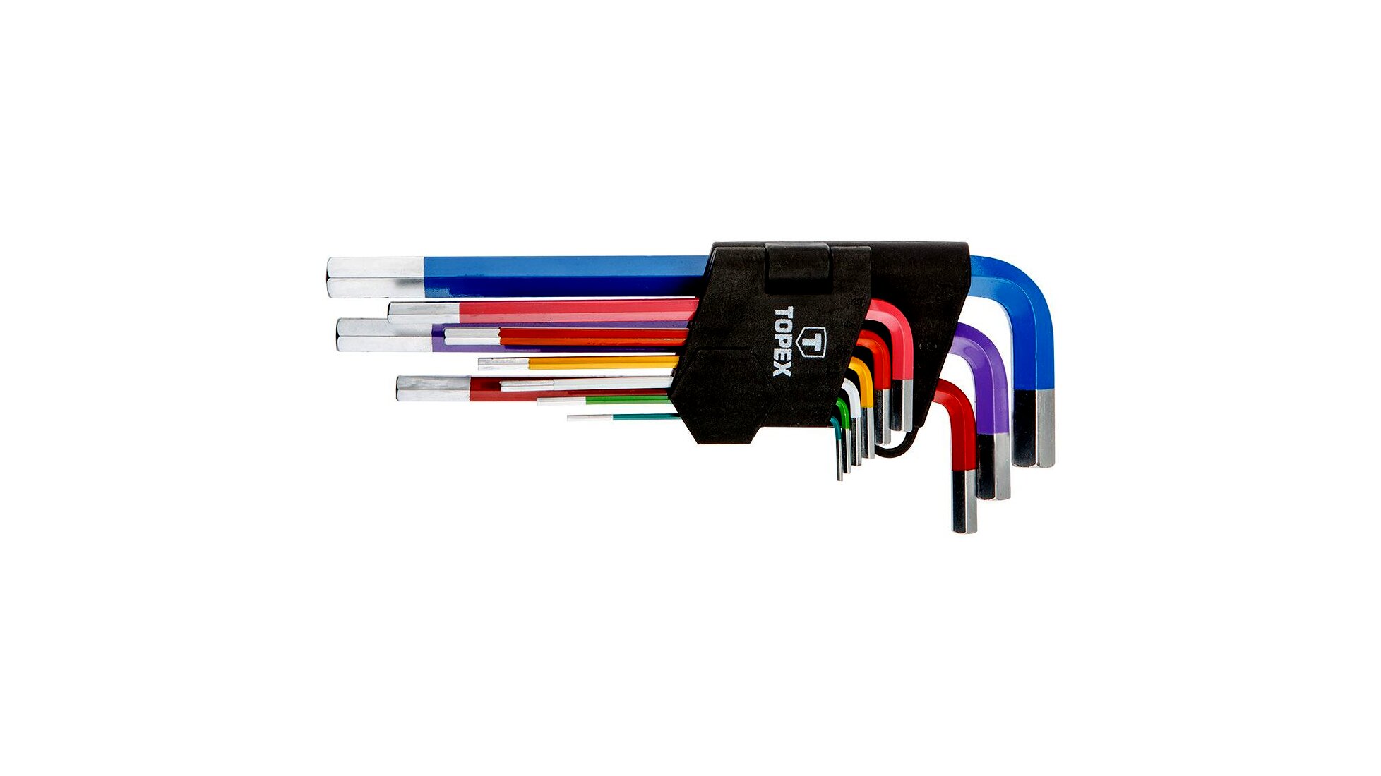 Imbuszkulcs készlet 9 db kulccsal, 1,5 - 10 közötti méretekben, szilárd króm-vanádium acélból. Minden kulcsméret más színnel jelölt, ami megkönnyíti a feladathoz megfelelő méret kiválasztását. A készlet praktikus csomagolásban kapott helyet. A TOPEX márka ezermestereknek készül.