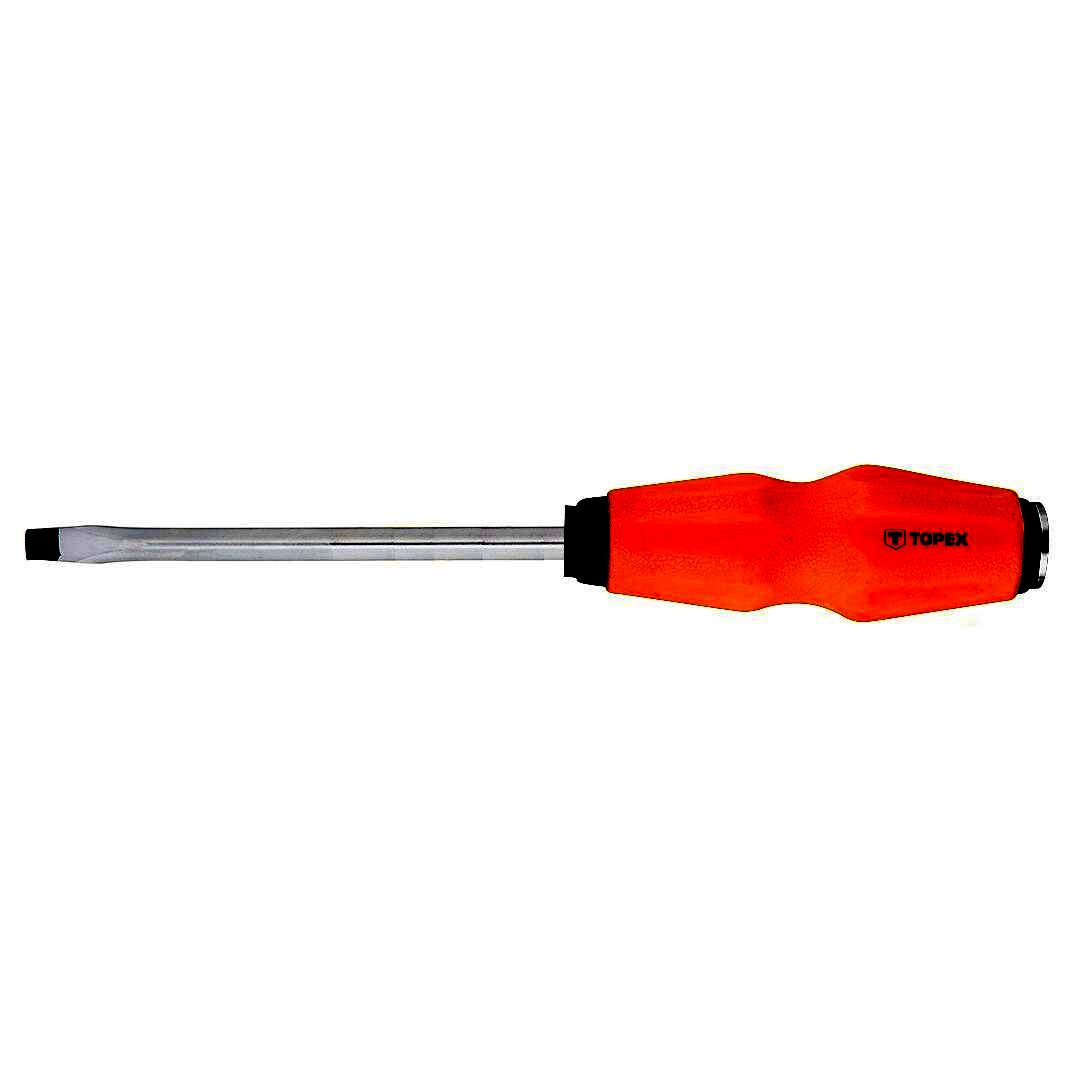A TOPEX üthető lapos csavarhúzó besült, túl erősen meghúzott csavarok kilazítására, meghúzására szolgál. Hegye nagy ellenállóképességű, a szerszámnak hosszú élettartamot biztosító króm-vanádium acélból készült. A mágneses hegy megkönnyíti a szerszámmal végzett munkát A műanyagból készült ergonómikus markolat jól fekszik a tenyérben, növelve a munkavégzés kényelmét. A TOPEX márka ezermestereknek készül.