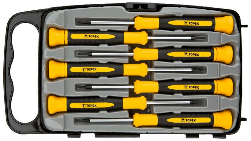 A TOPEX műszerész csavarhúzó készlet kiválóan beválik szerelési, barkácsolási munkákban. A hét csavarhúzó mindegyikének hegye nagy ellenállóképességű, a szerszámnak hosszú élettartamot biztosító króm-vanádium acélból készült. A mágneses hegy megkönnyíti a szerszámmal végzett munkát Az ergonómikus, csúszásmentes anyaggal bevont műanyag markolat biztosítja a kényelmet és a biztonságot a munkavégzés során. A praktikus csomagolás megkönnyíti a tárolást és a szállítást A TOPEX márka ezermestereknek készül.