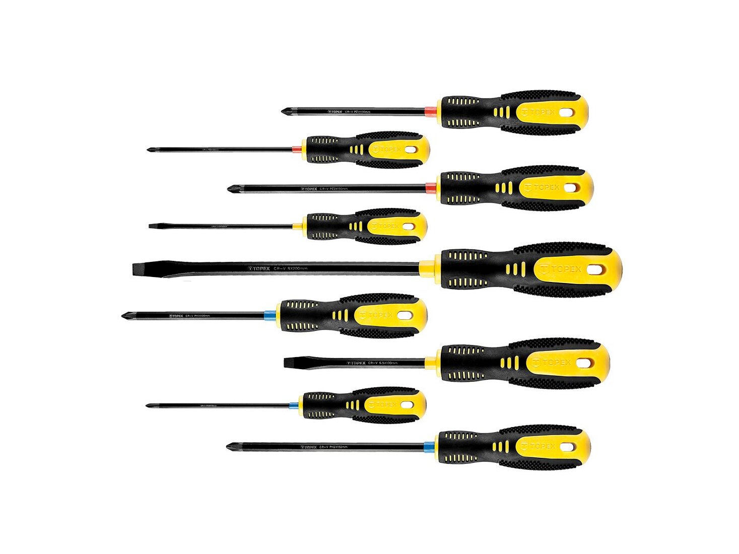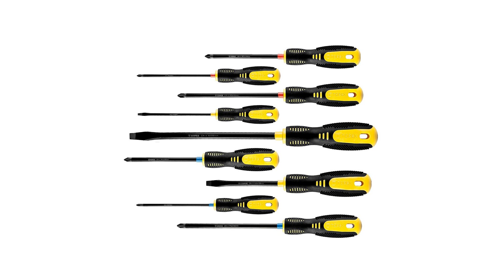 A TOPEX csavarhúzókészlet kiválóan alkalmas szerelési, barkácsolási munkákhoz. Kilenc csavarhúzó mindegyikének hegye nagy ellenállóképességű, a szerszámnak hosszú élettartamot biztosító króm-vanádium acélból készült. A mágneses hegy megkönnyíti a szerszámmal végzett munkát Az ergonómikus, csúszásmentes anyaggal bevont műanyag markolat biztosítja a kényelmet és a biztonságot a munkavégzés során. A TOPEX márka ezermestereknek készül.