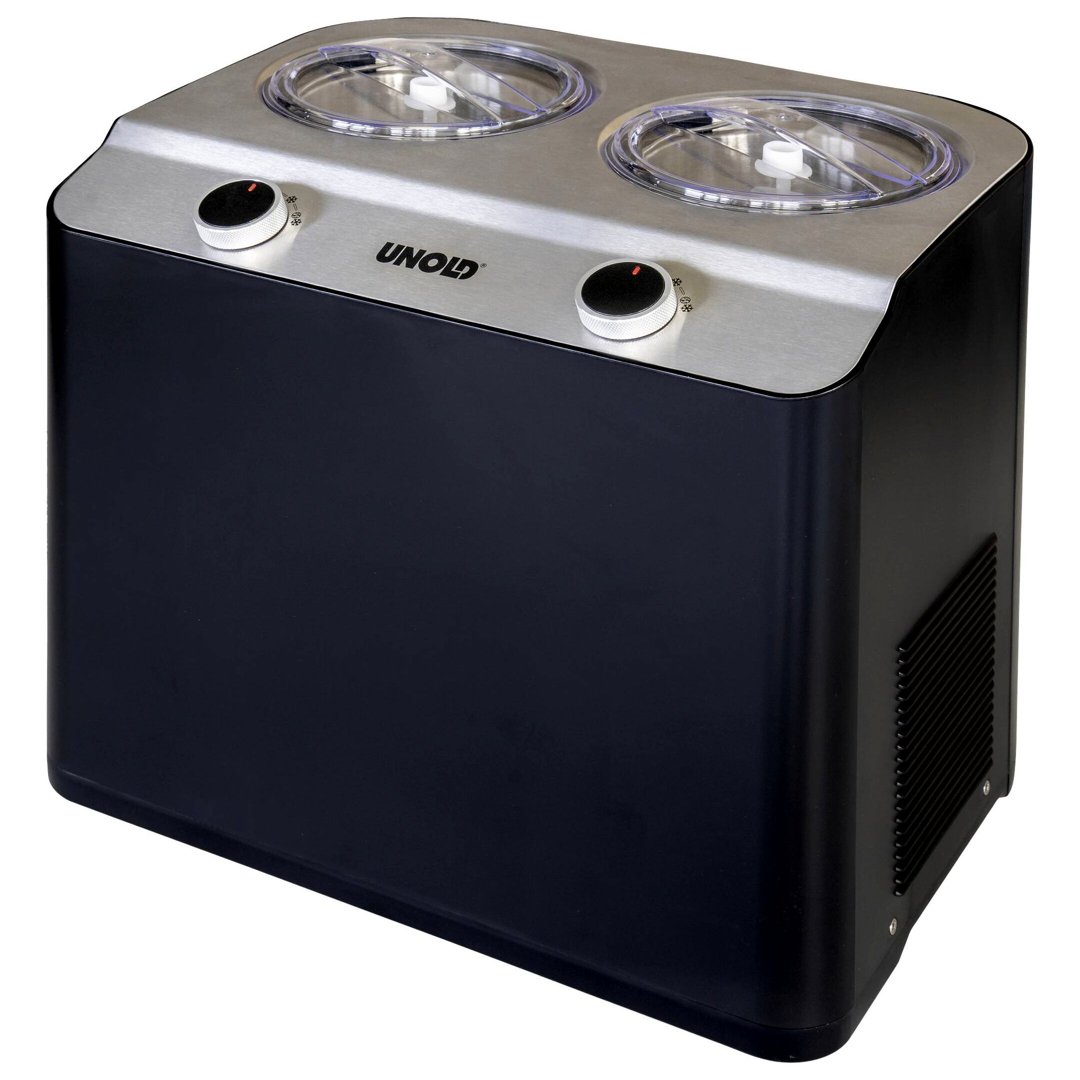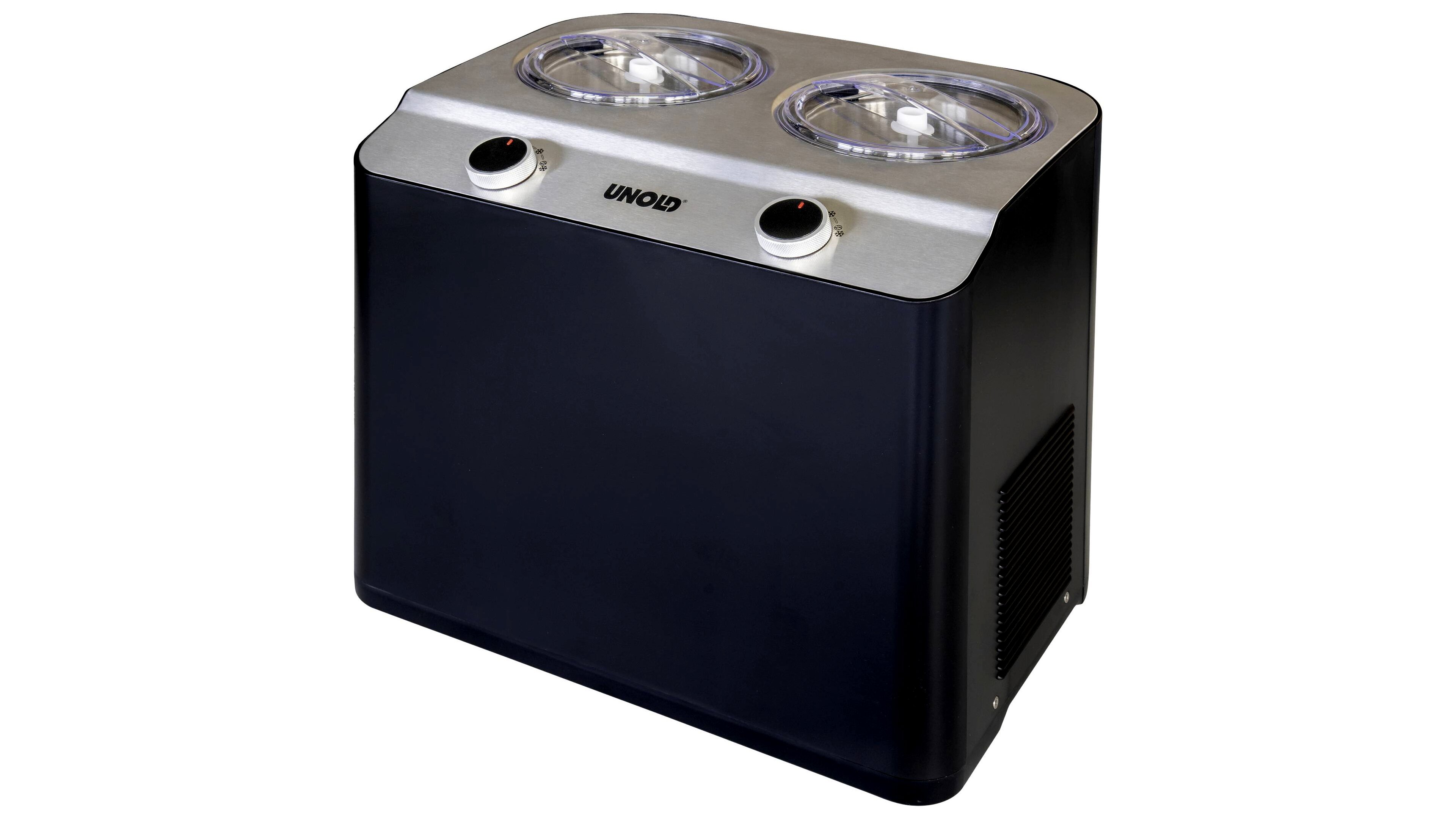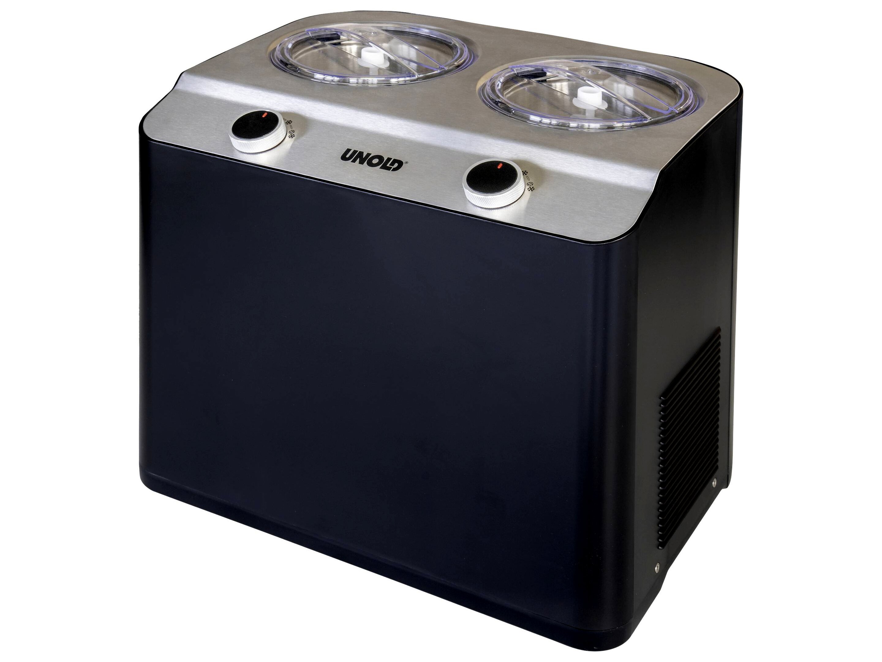 Az Unold Doppio nero egy duplatartályos, kompresszoros fagylaltkészítő gép, amellyel két külön édességet készíthet egyszerre, külön-külön vezérelhető keverőtálakban. A beépített, önhűtő kompresszor folyamatosan biztosítja a hideget, így nincs szükség előzetesen fagyasztott hűtőedényre.