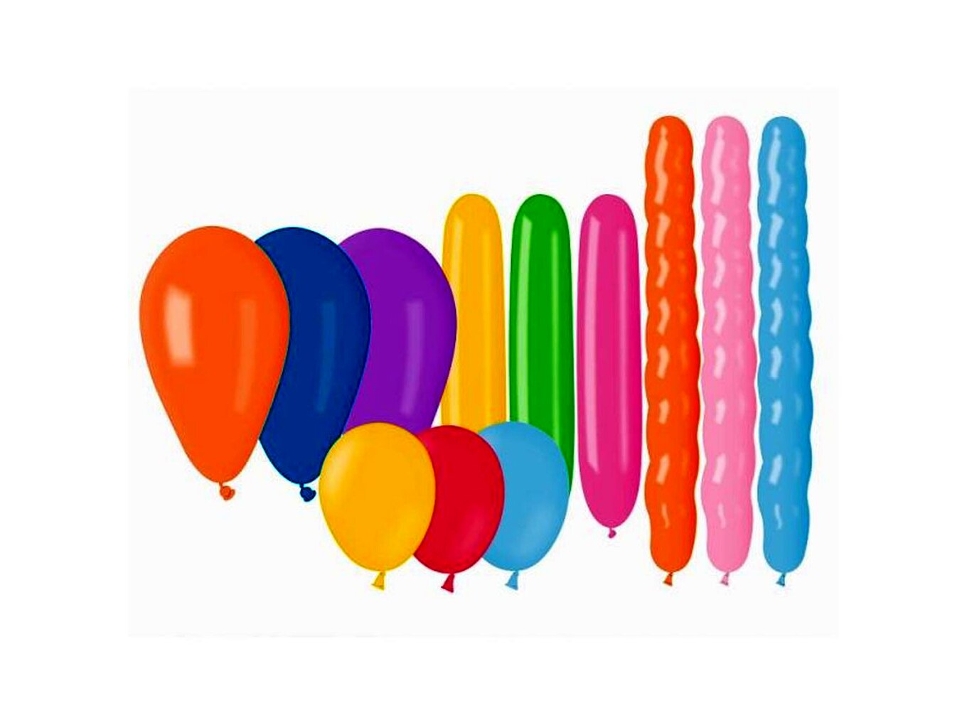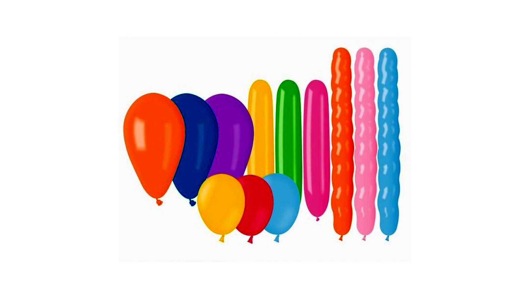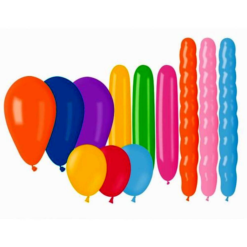 Különböző méretű, formájú és színű mókás lufi csomag.
