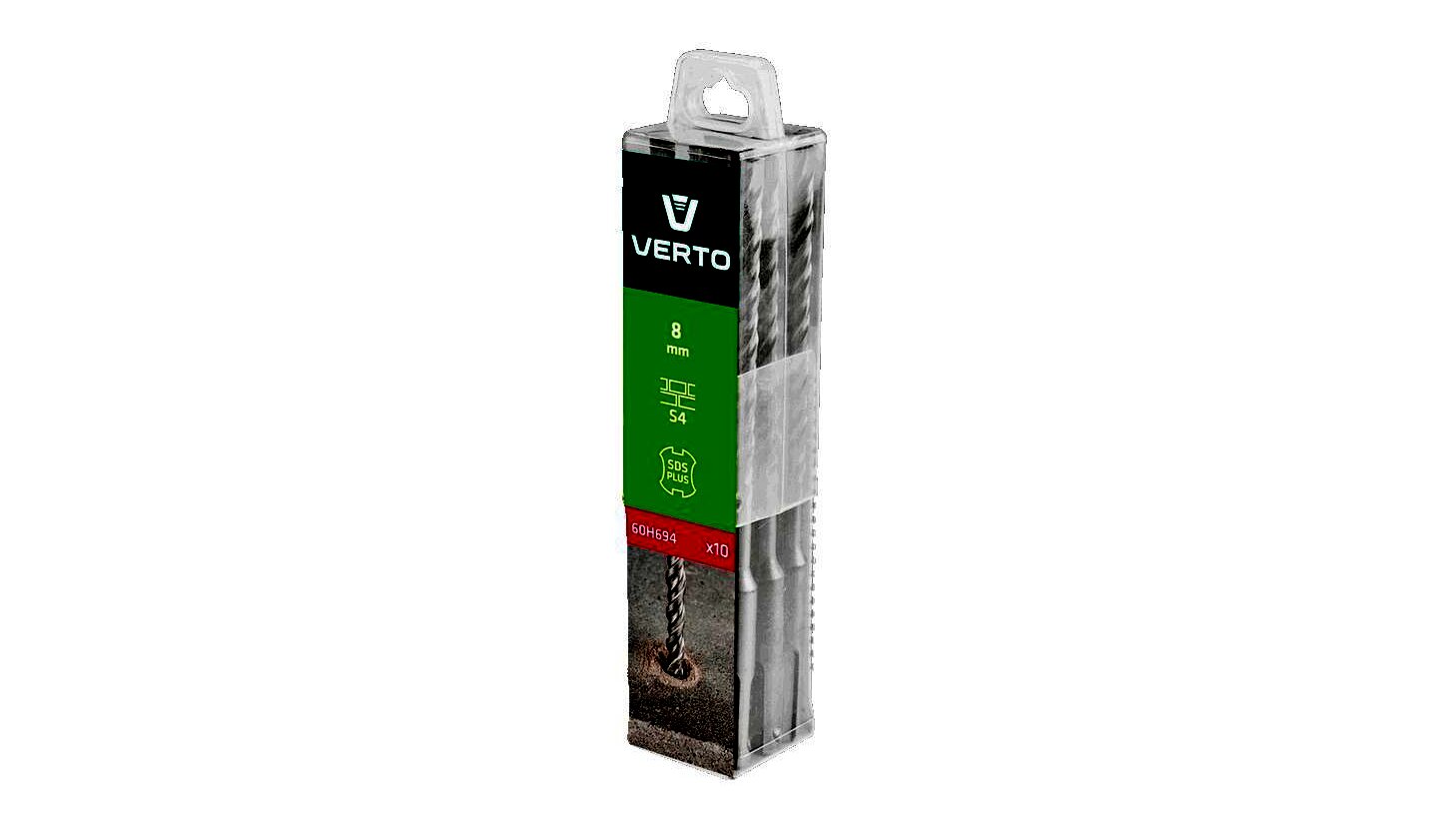 A VERTO SDS+ befogású, 8.0 mm átmérőjű betonfúrószár (kat. sz. 60H694) hatékony betonfúrást tesz lehetővé. Az S4 típusú dupla spirál biztosítja a megfelelő anyagelvezetést, védve a fúrószárat a túlmelegedés ellen.