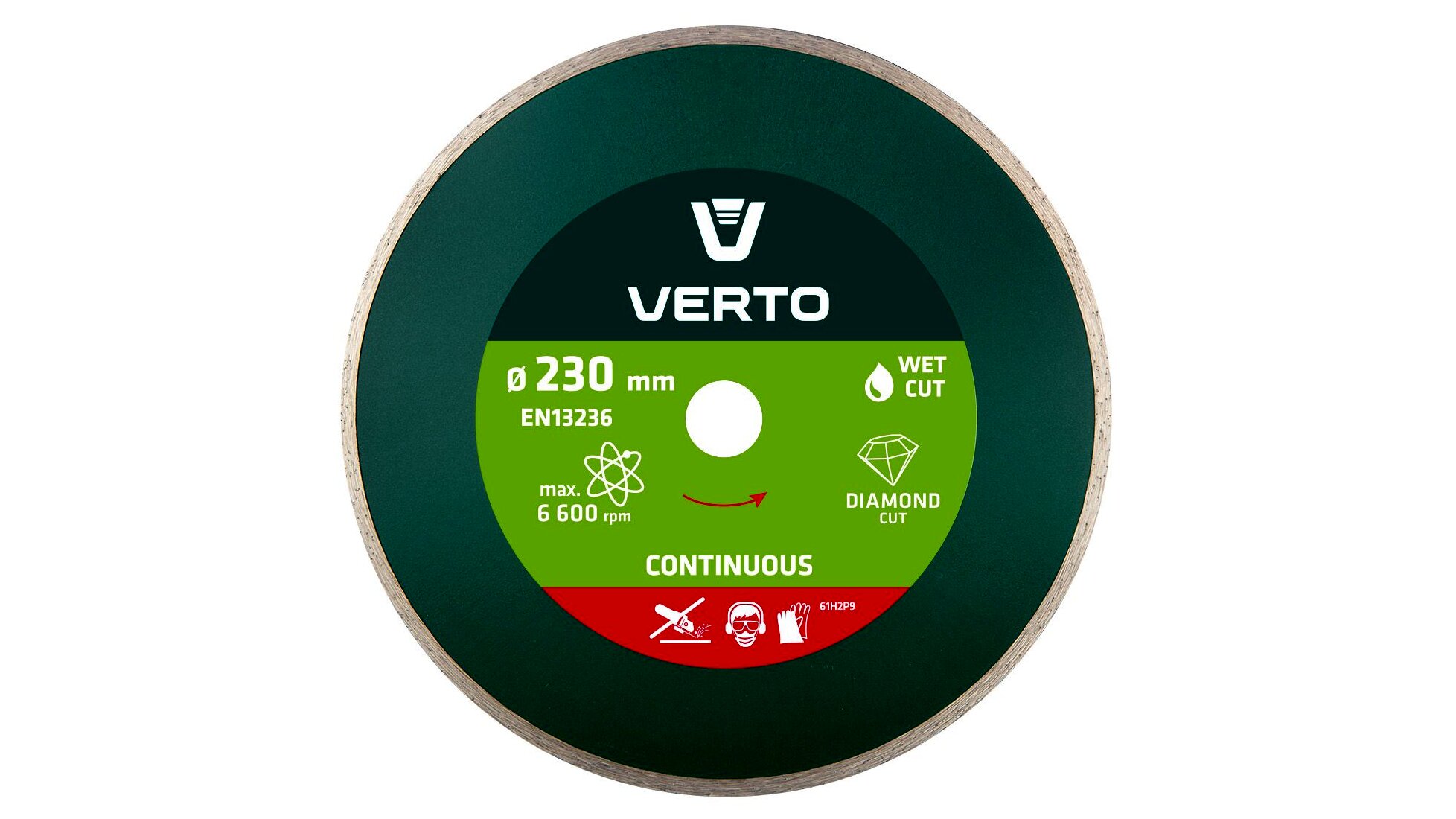 A VERTO folyamatos élű gyémánttárcsa kerámia, pl. terrakotta, gress, gránit, márvány precíz vágására szolgál.Élkiképzése miatt a vágáskor nem töredezik az anyag széle. A VERTO márka ajánlata elektromos kéziszerszámokat és tartozékokat tartalmaz az ezermesterek számára.