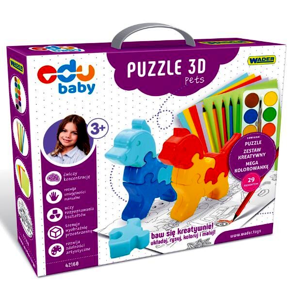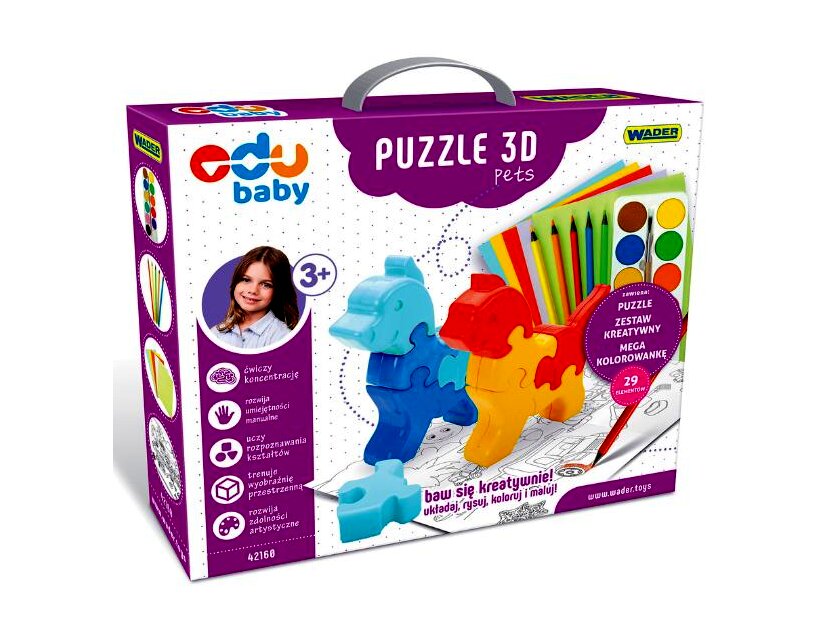 A Wader 3D kirakója a háziállatok világába kalauzolja el az óvodáskorú gyerekeket. A praktikus, fogantyús táskában egy kutya és egy cica bújik meg, akik arra várnak, hogy a szorgos kezecskék összerakják őket. Ha a kirakás már flottul megy, a kicsik kiszínezhetik vagy megrajzolhatják a készlet festékeivel és ceruzáival az állatkák lakóhelyét, vagy akár meg is hajtogathatják a házikójukat a színes papírokból.