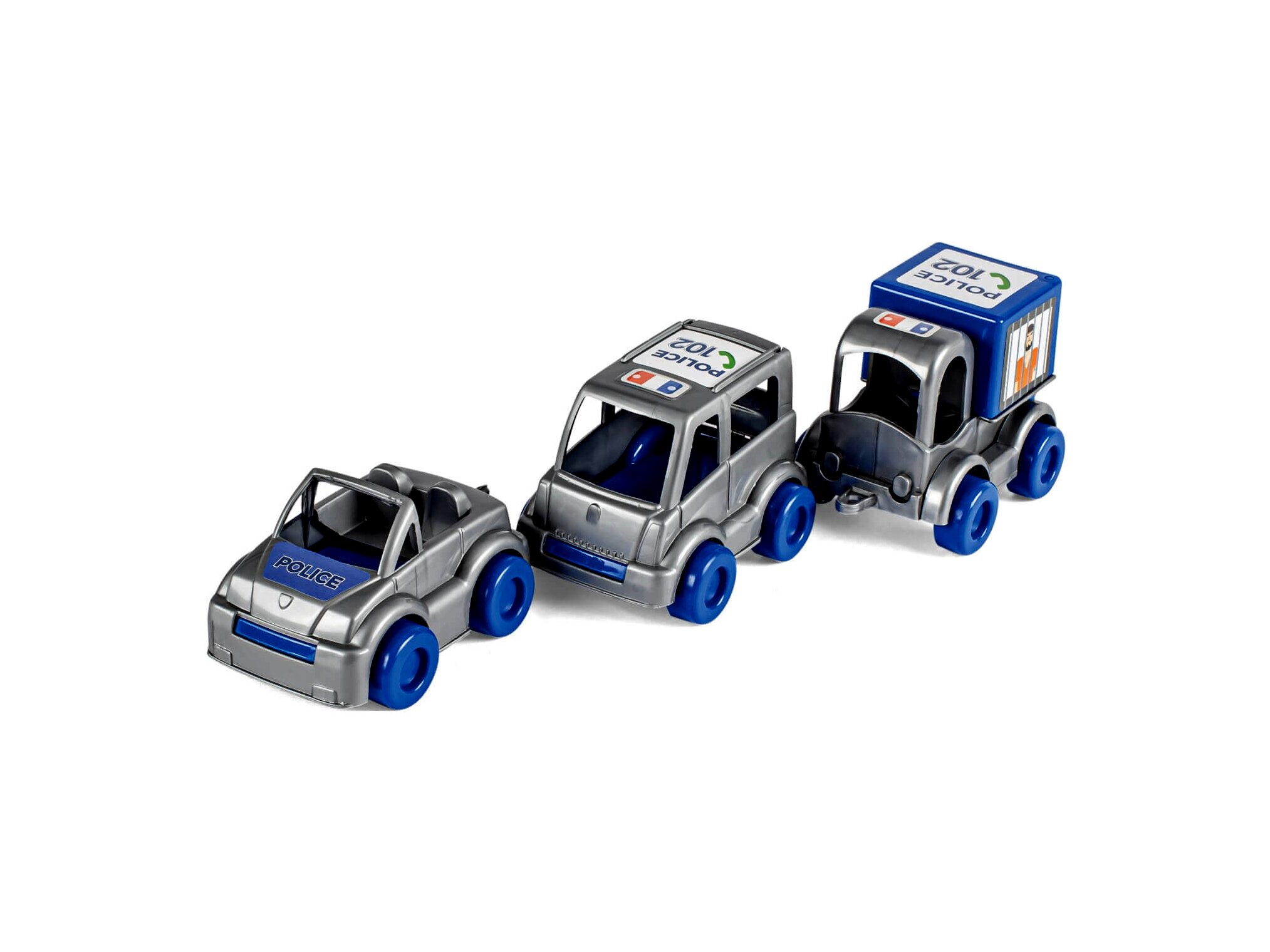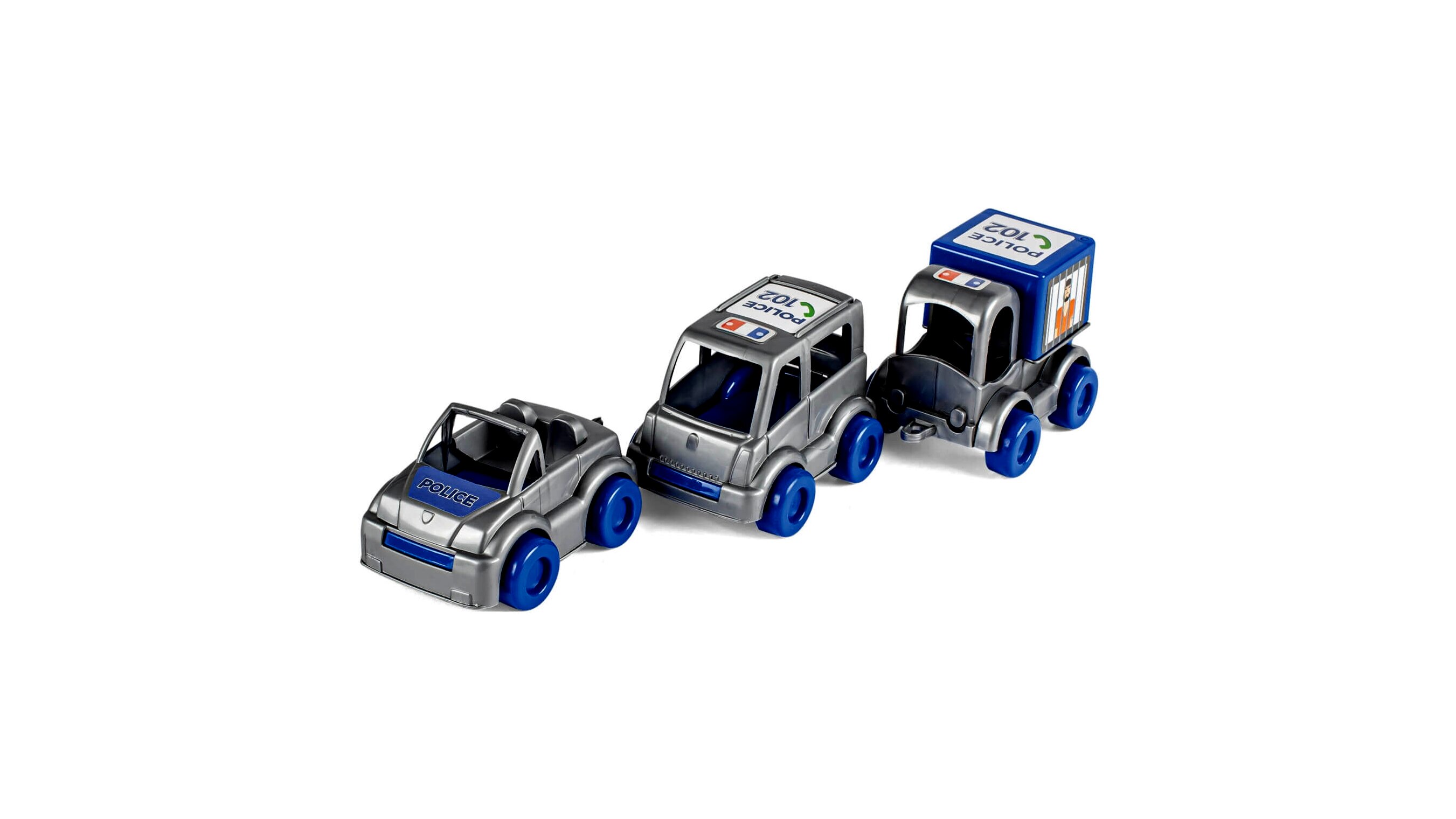 Csomag tartalma: 1 db nyitott tetejű rendőrautó, 1 db zárt tetejű rendőrautó, 1 db teherautó.