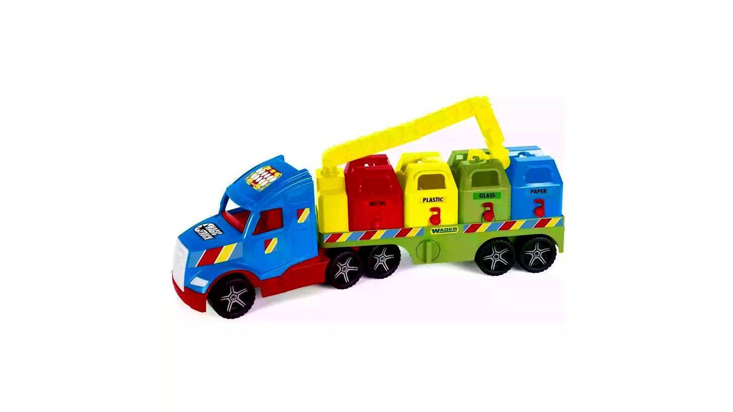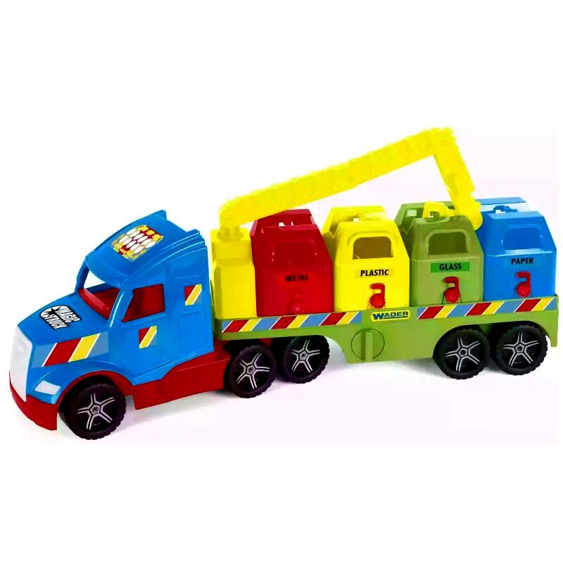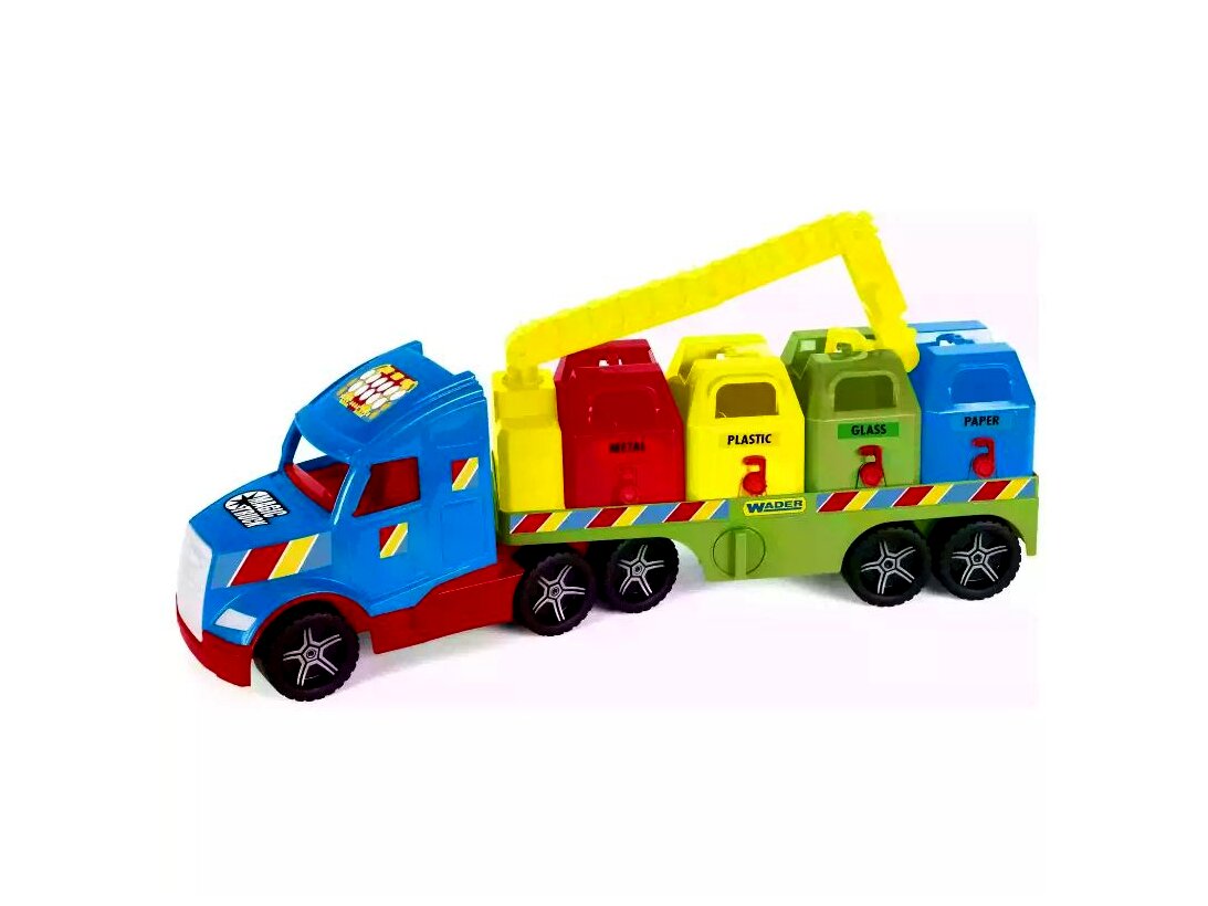 A Wader Magic Truck Basic szelektív kukásautójával a gyerekek eljátszhatják a hulladékszállítók életének legizgalmasabb jeleneteit.Az igényesen kidolgozott, élénk színű járgány kerekei valóban gurulnak, pótkocsija elforgatható, valamint lecsatolható. A rakodófelületen különböző színű szelektív kukák (üveg, papír, műanyag és fém) sorakoznak, amelyeket a gyerekek az emelő segítségével le- és felhelyezhetnek a pótkocsira. A játék jármű strapabíró, magas minőségű anyagból készült, így a gyerekek sokáig élvezhetik majd a vele való játékot.