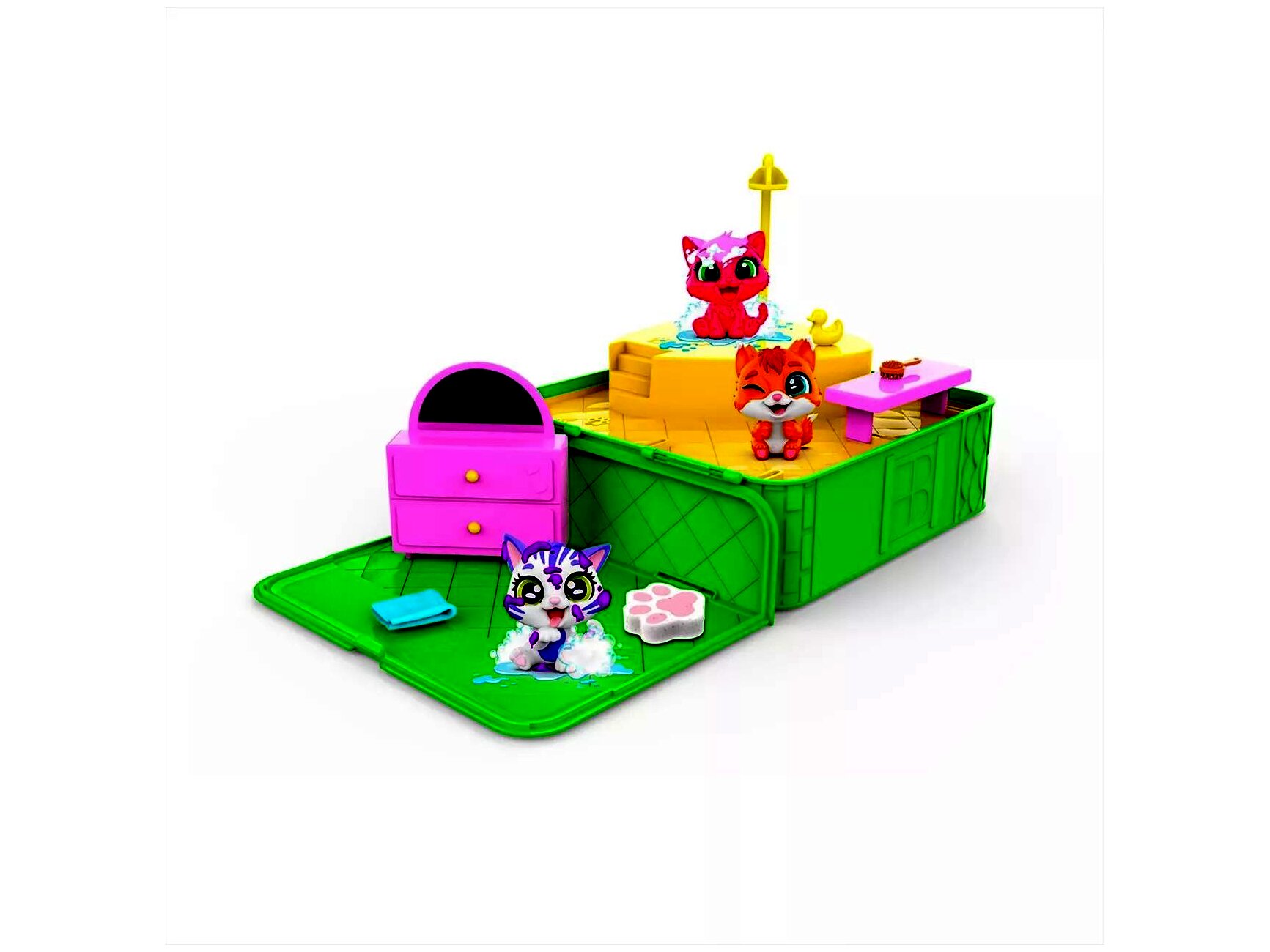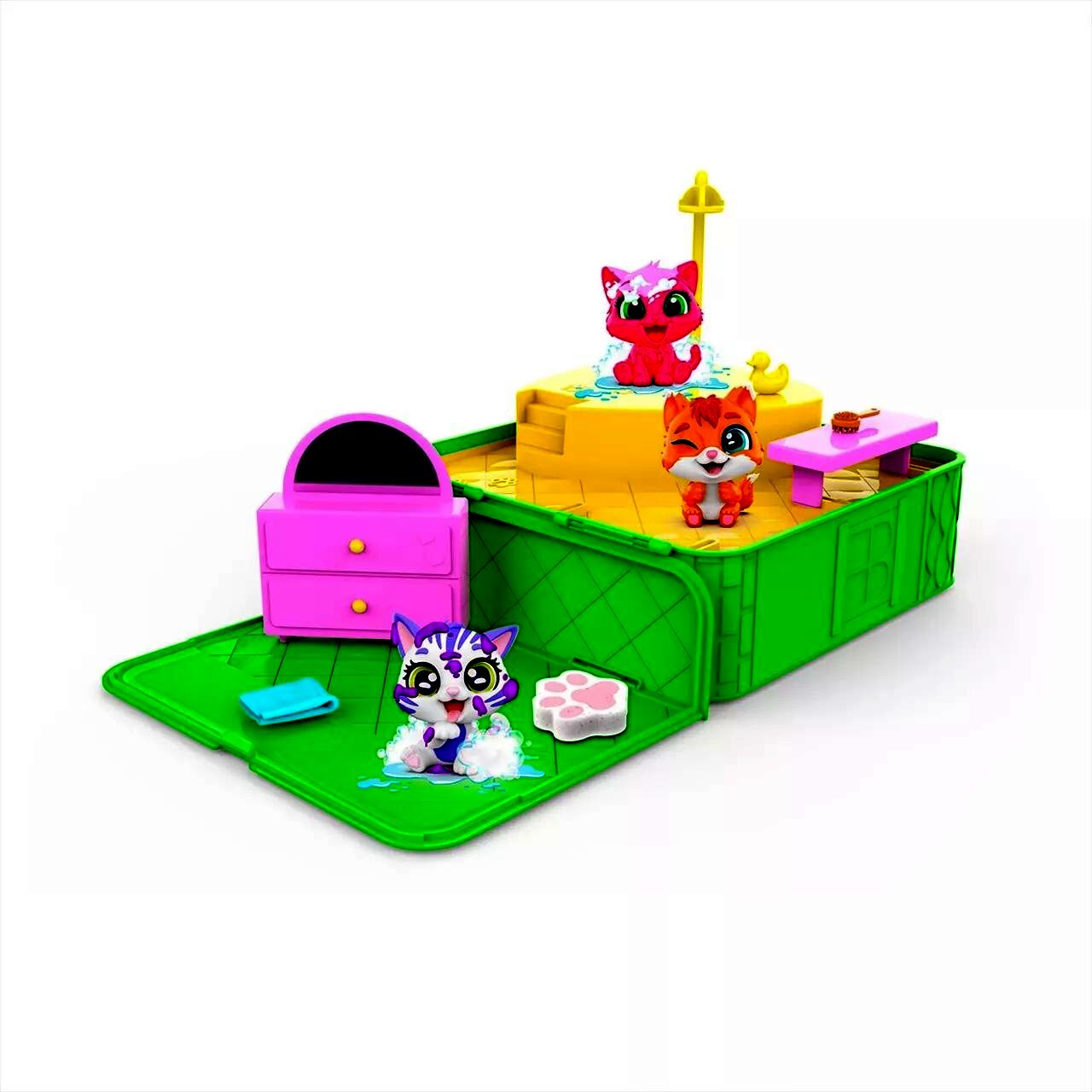 A szett két különböző 6,8 cm magas cica figurát, egy pezsgőfürdőt és öt kiegészítőt tartalmaz, amelyek még szórakoztatóbbá teszik a játékot.A kiegészítők között található: