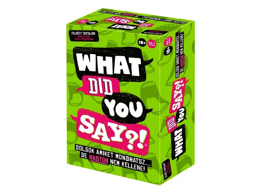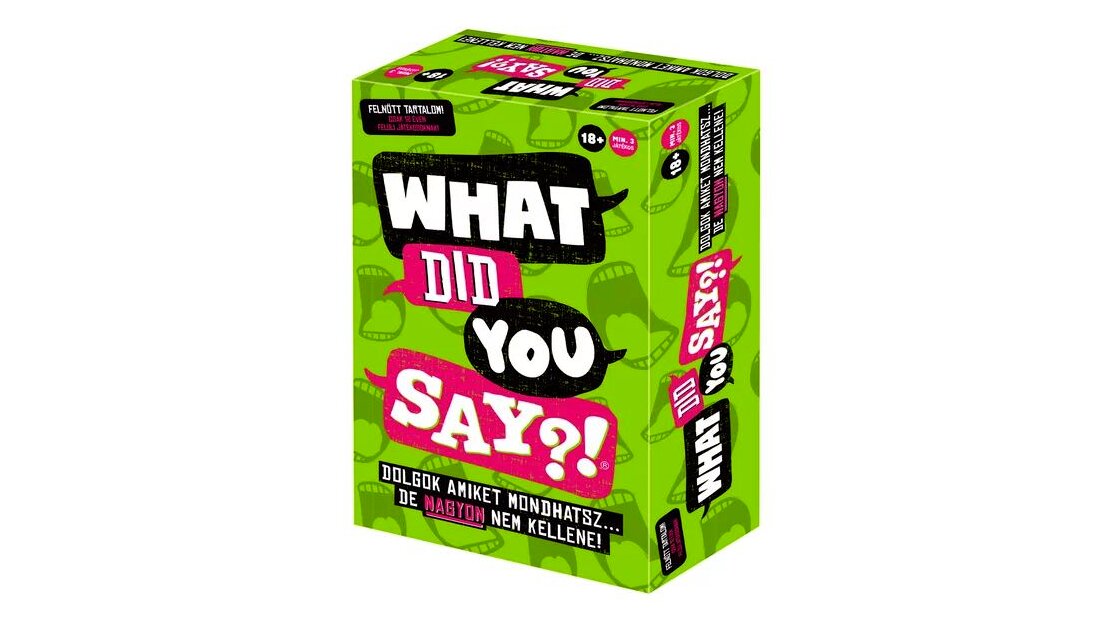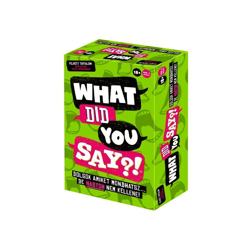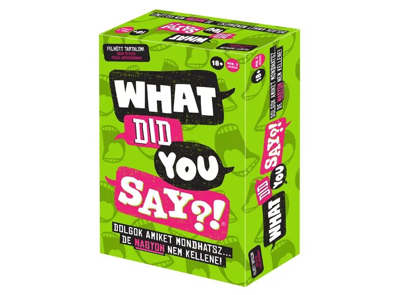 Felkészültél egy felejthetetlen partijátékra? A "What Did You Say?" társasjáték garantáltan megnevetteti a társaságot és feldobja az estét. Ez a felnőtteknek szóló játék a legmerészebb mondatokat hozza elő, amiket nyilvánosan talán sosem mernél kimondani.
