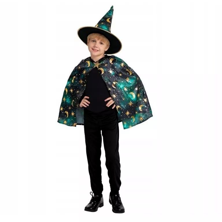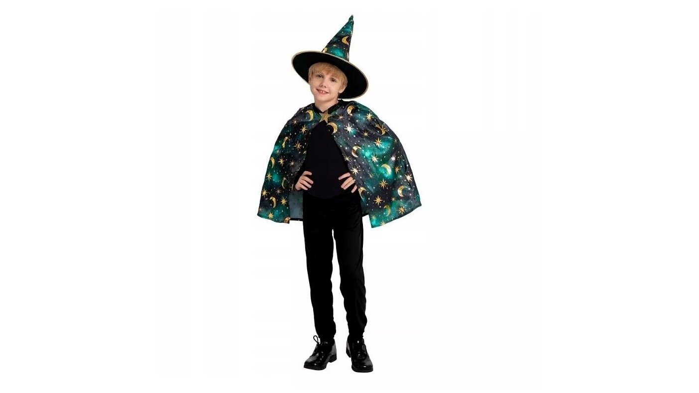 A zöld varázsló jelmez egy könnyen felvehető, kényelmes jelmezszett gyerekeknek, amely jelmezes bulikhoz, iskolai rendezvényekhez vagy otthoni szerepjátékhoz ideális. A csillag- és holdmintás köpeny és a hozzá illő kalap látványos megjelenést ad, miközben a gyerekek szabadon mozoghatnak játék közben.
